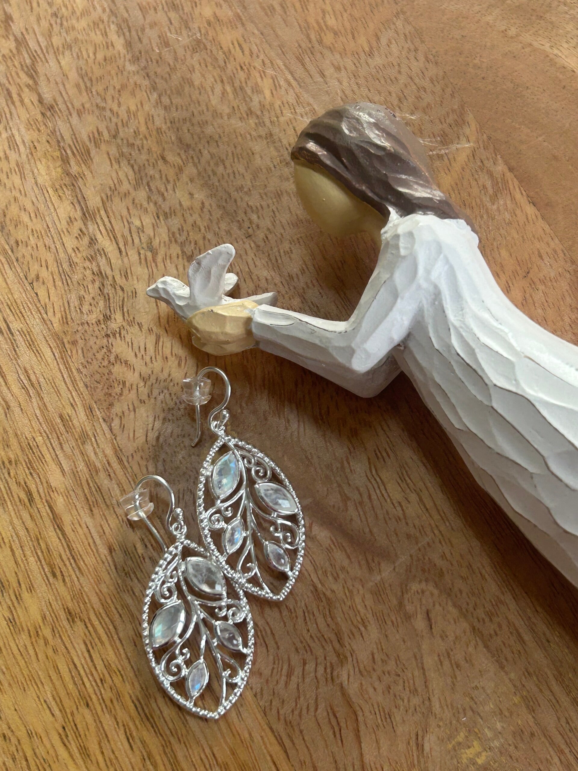 Länge: 3.5cm; Silber 925 Anhänger "Blatt" (3.2 x 2.0cm) und Verschluss; kleine Blätter facettierter Mondstein Regenbogen
