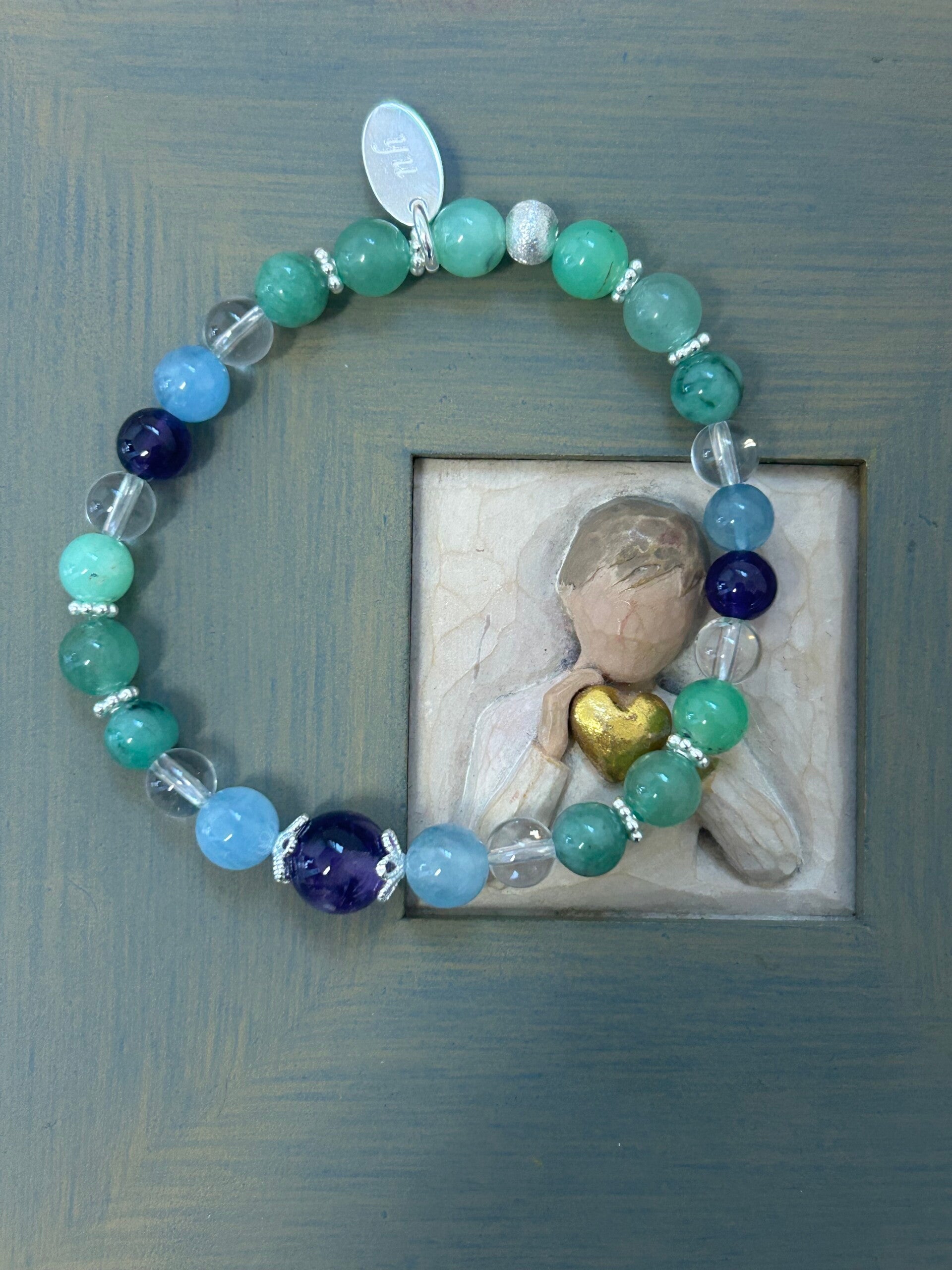 Heilsteine (Link zu Beschreibung und Wirkung): Amethyst, Aventurin-Quarz grün, Bergkristall, Beryll blau (Aquamarin), Chrysopras, Smaragd (Beryll grün)