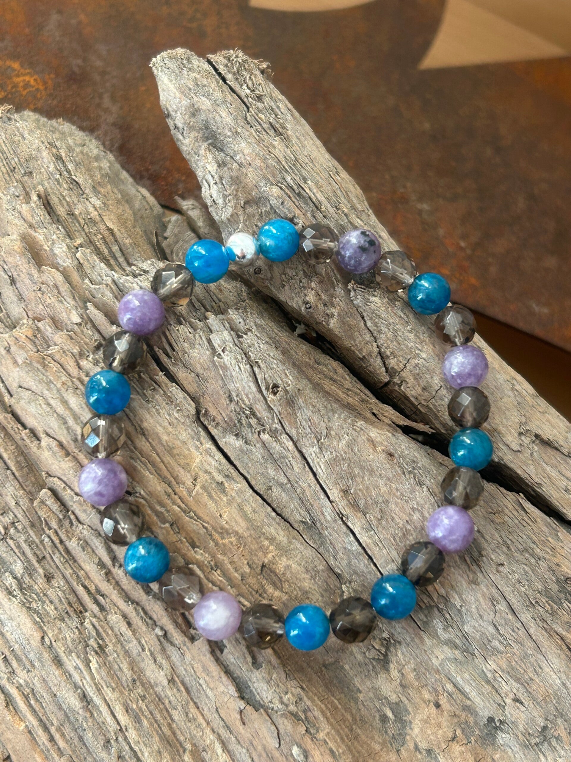 Heilsteine (Link zu Beschreibung und Wirkung): Apatit blau, Lepidolith, Rauchquarz