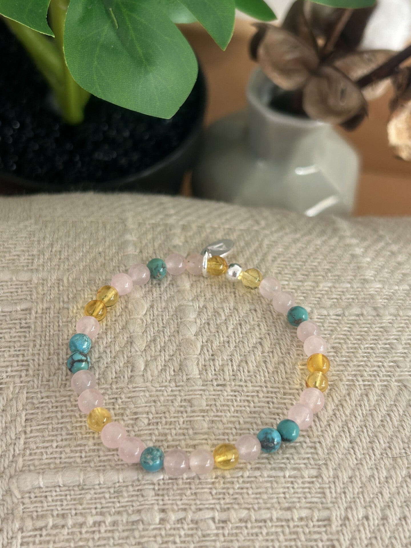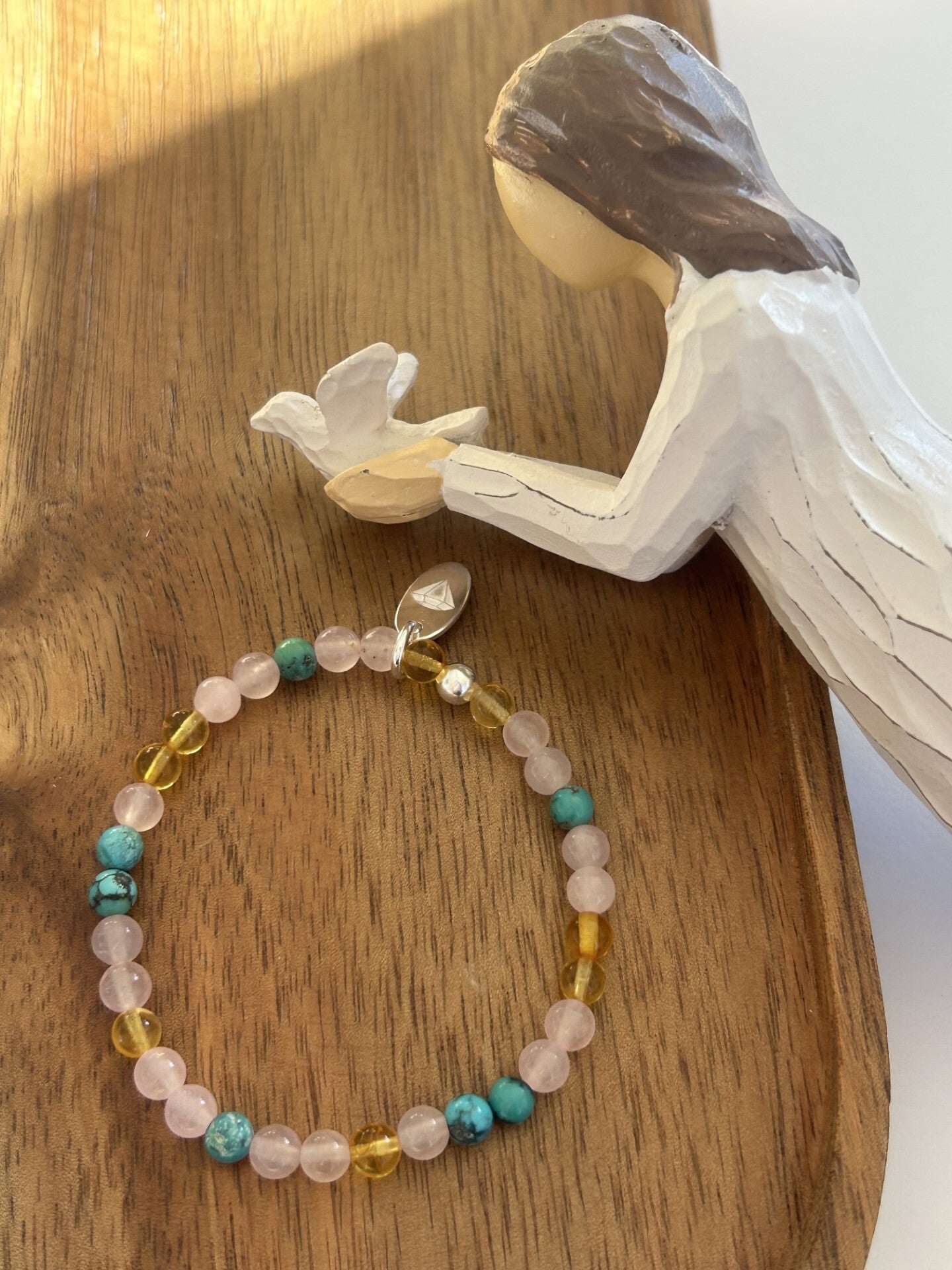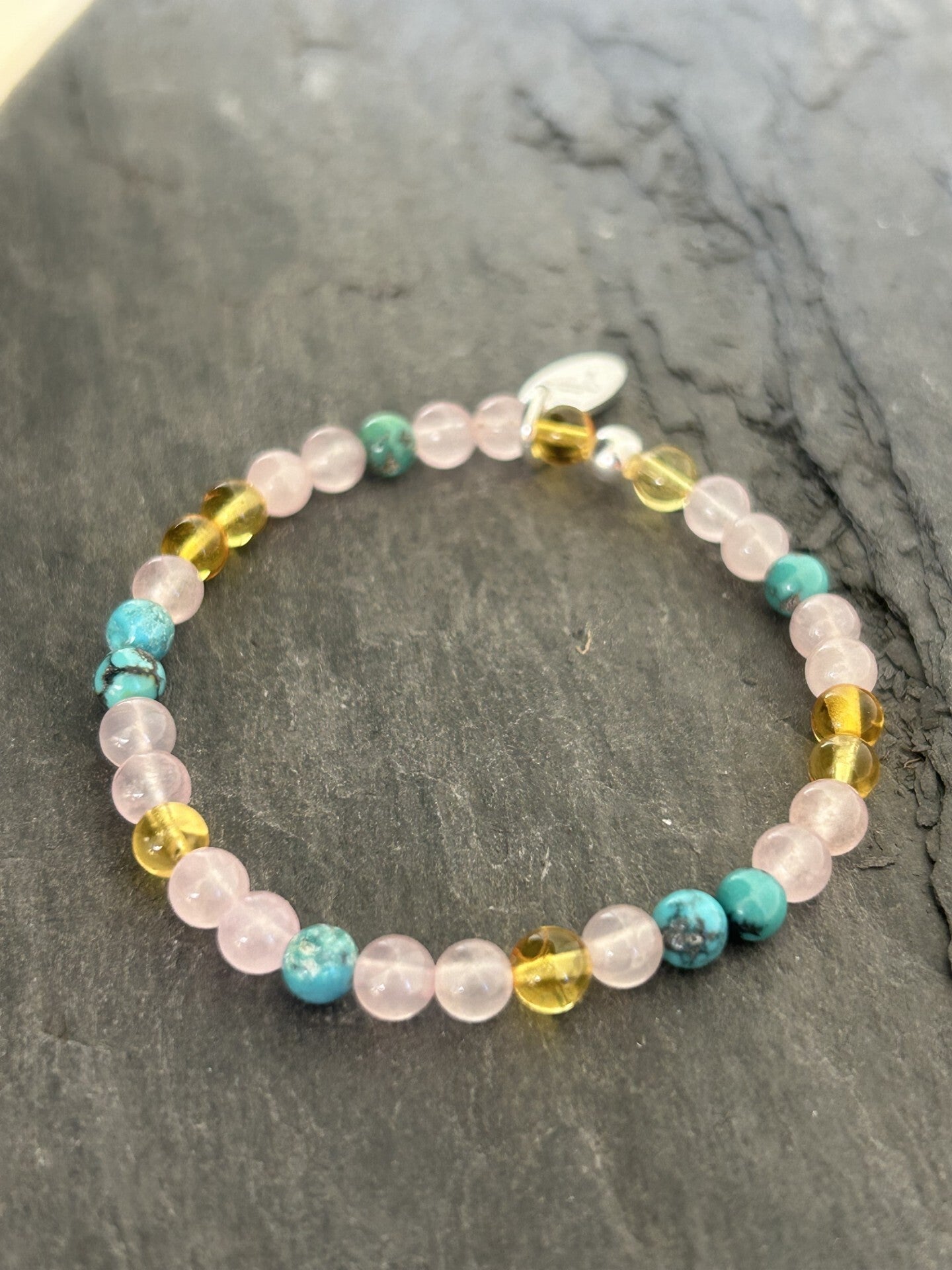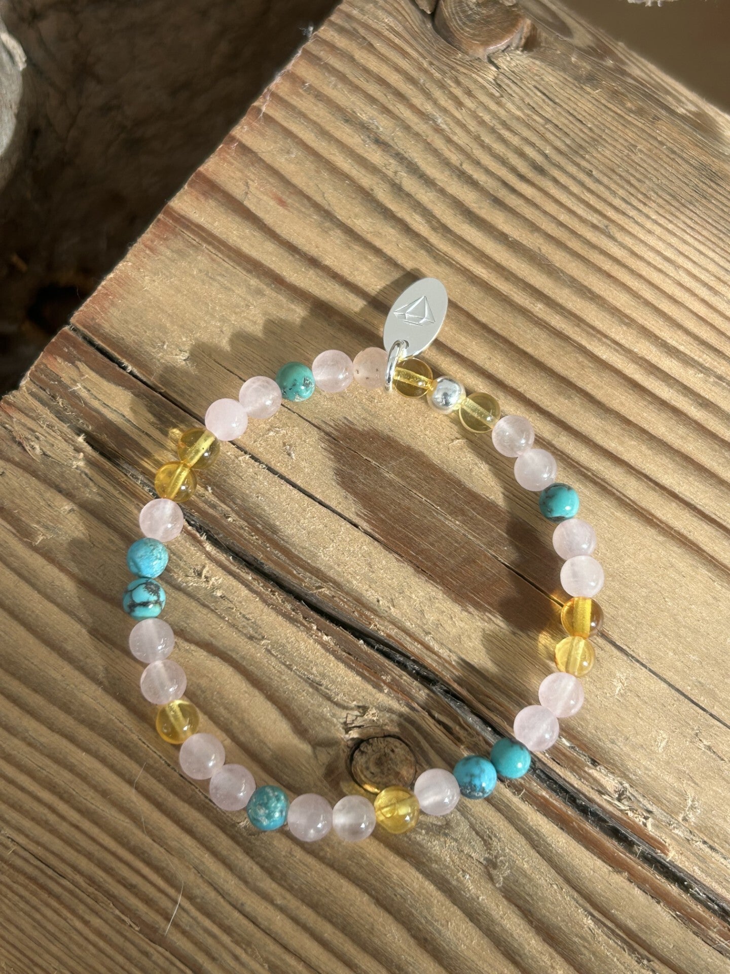 Heilsteine (Link zu Beschreibung und Wirkung): Bernstein, Rosenquarz, Türkis Tibet dunkel