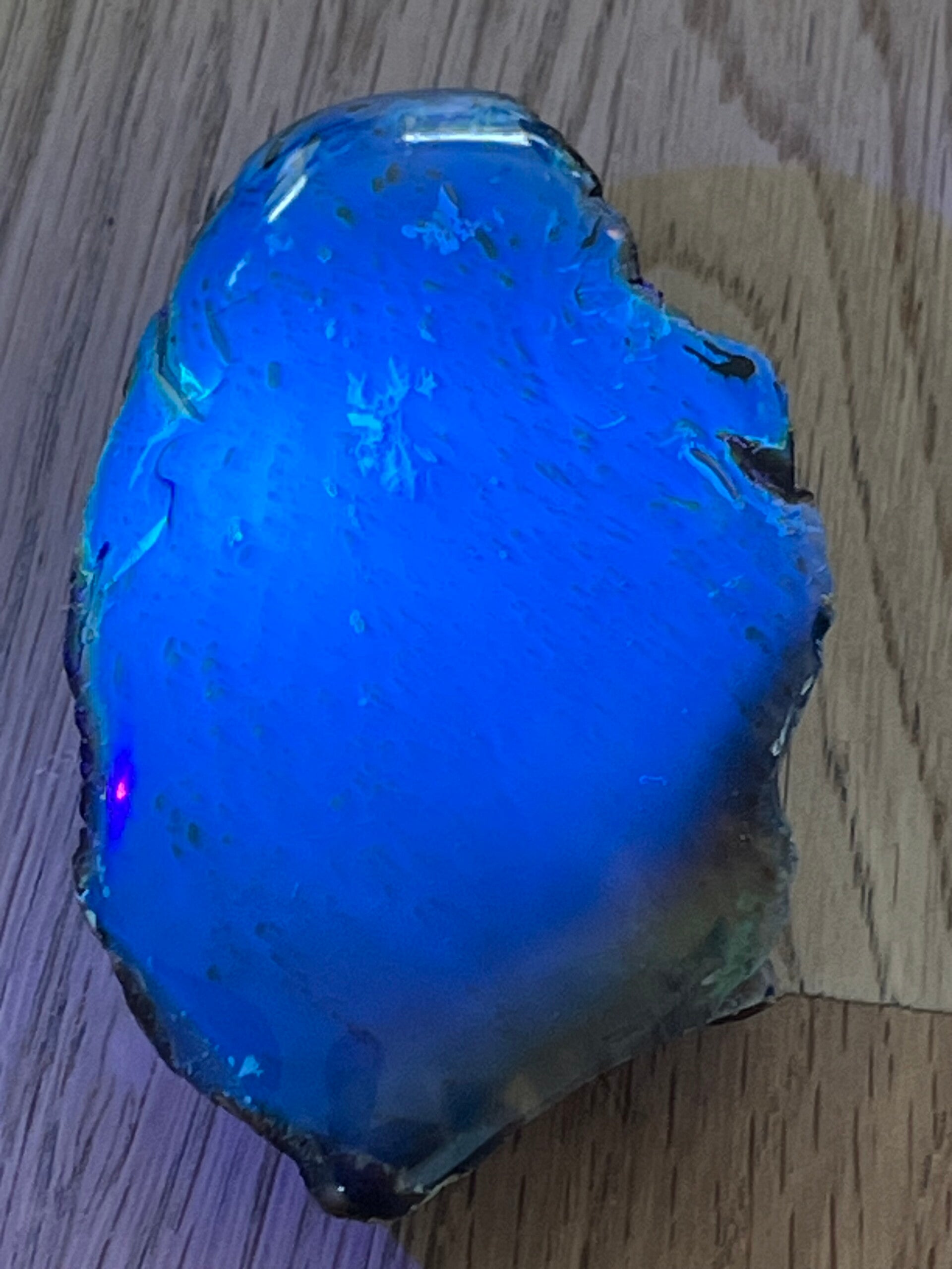 Mit UV-Licht beleuchtet wird der Bernstein ganz blau.
