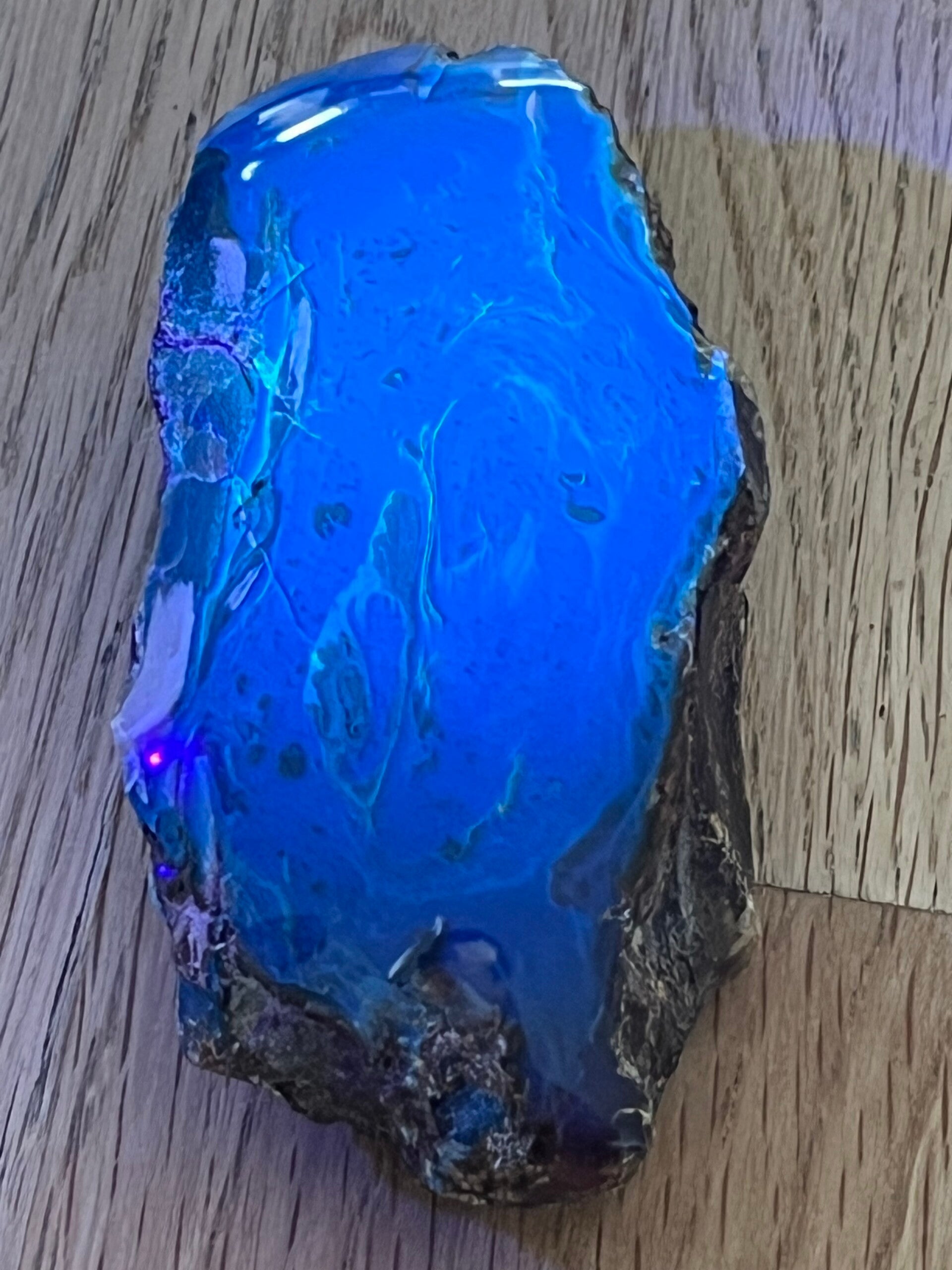 Mit UV-Licht beleuchtet wird der Bernstein ganz blau.