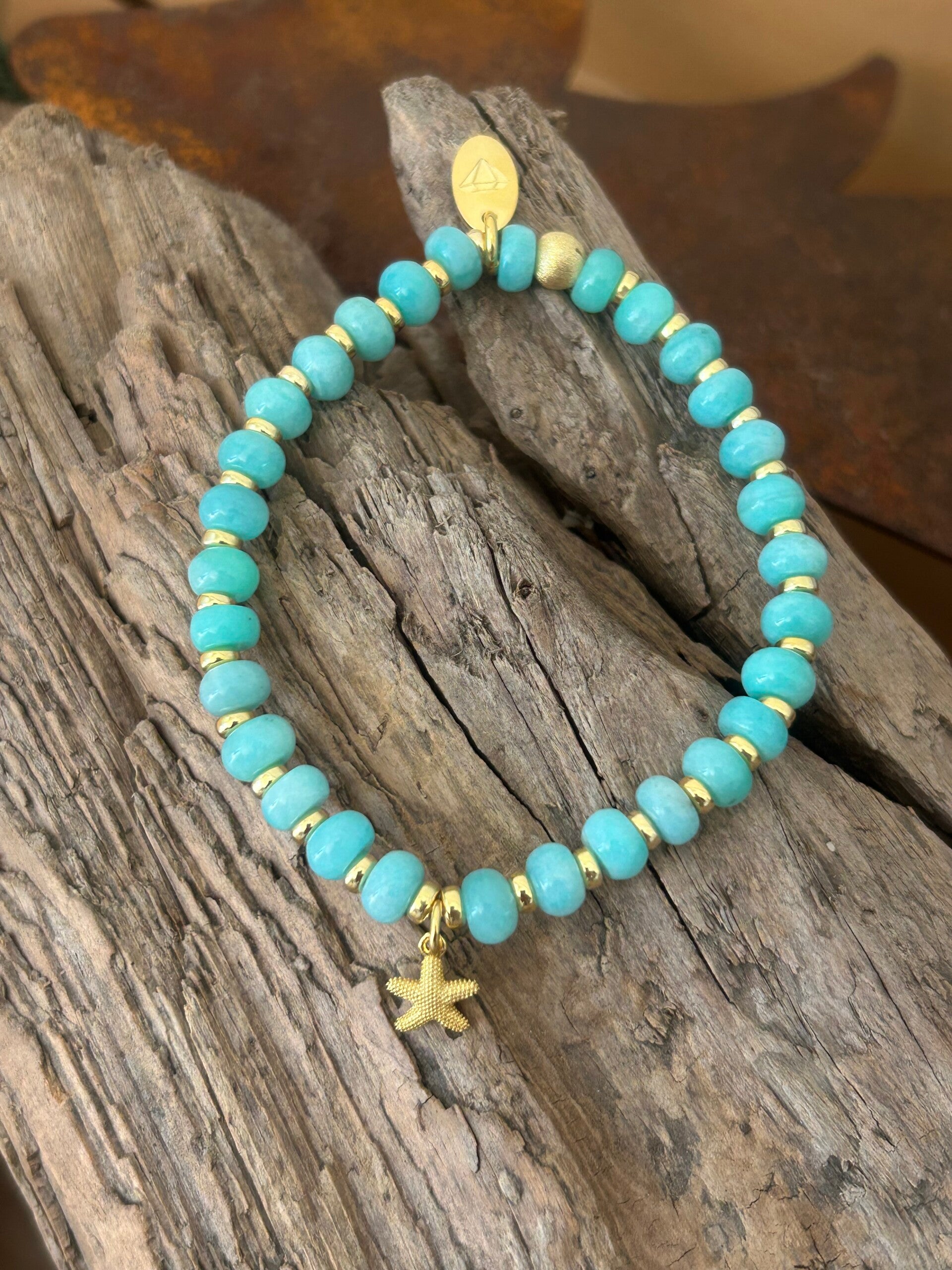 Hinweis: mit Stretch-Band (Länge 15 - 22 cm wählbar); Silber 925 vergoldeter Anhänger "Seestern" und Elemente; 6mm Linsen