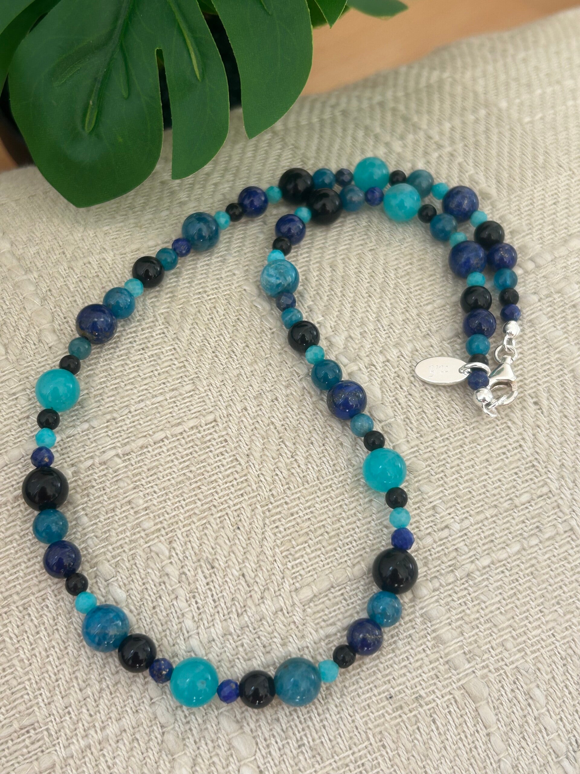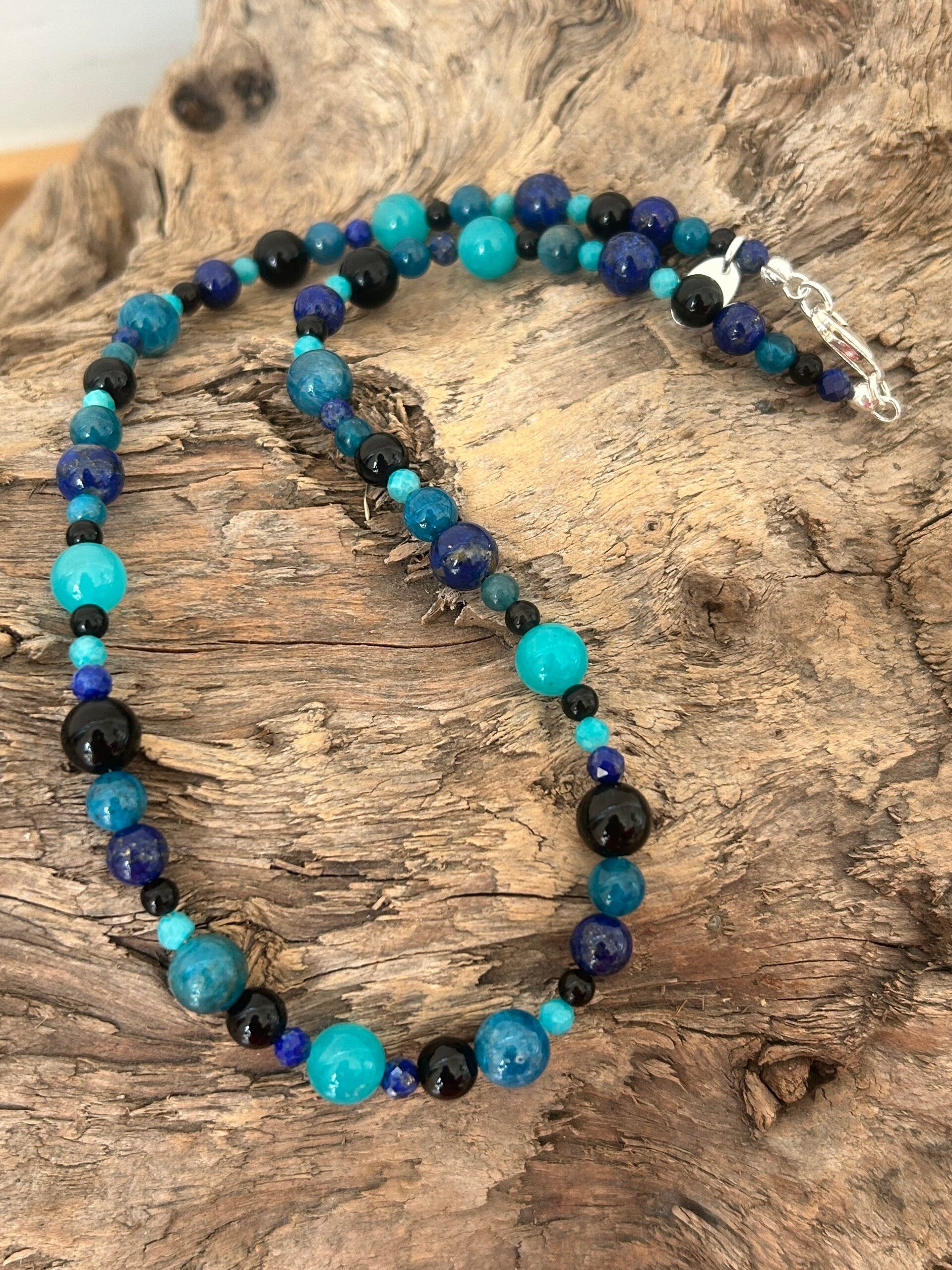Heilsteine (Link zu Beschreibung und Wirkung): Amazonit USA AAA-Qualität, Apatit blau, Lapislazuli, Obsidian schwarz