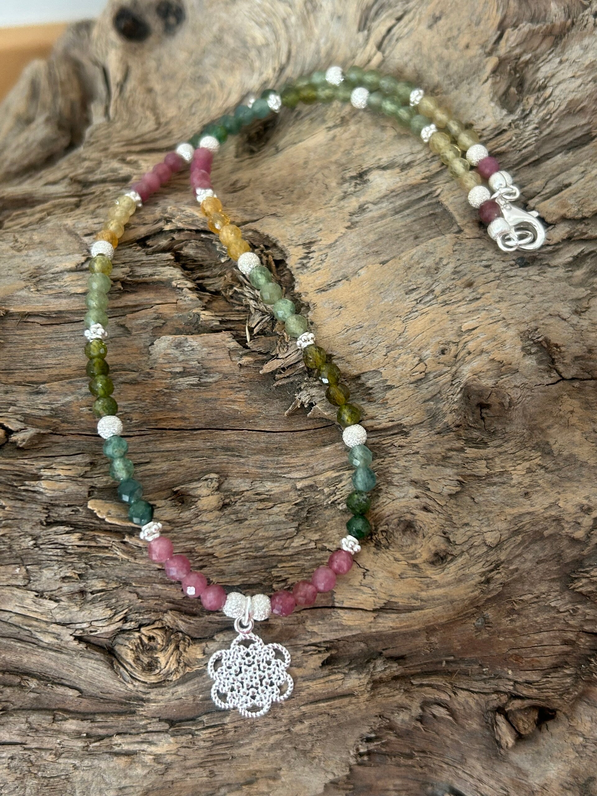 Länge auf diesem Bild: 43 cm (Deine genaue Wunschlänge im Kommentar eintragen und die entsprechende Preisklasse wählen); Silber 925 diamantierte Kugel, Silber 925 Anhänger "verspielte Blume" und Elemente; Kugeln 4mm facettiert