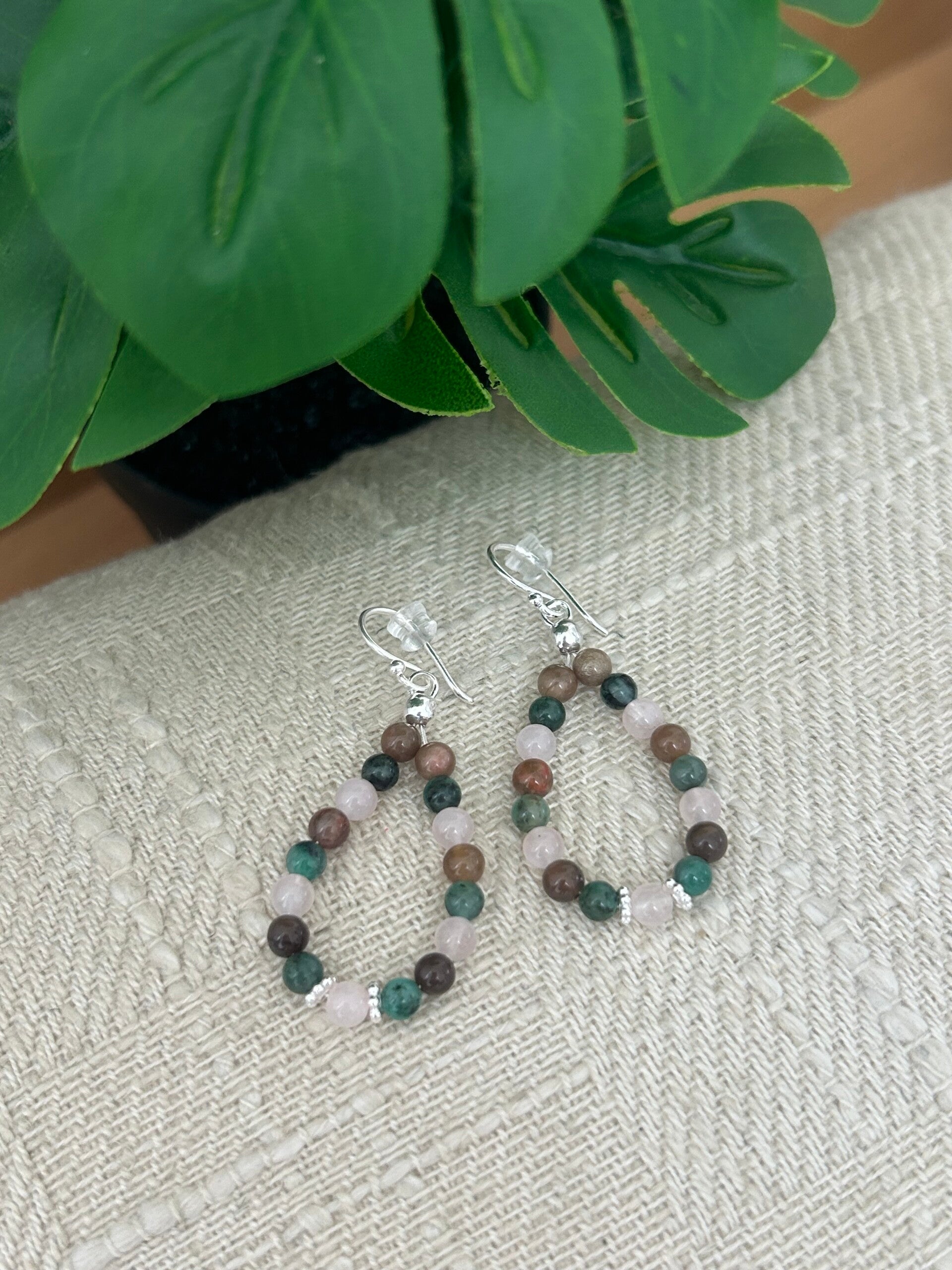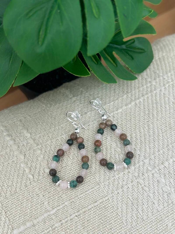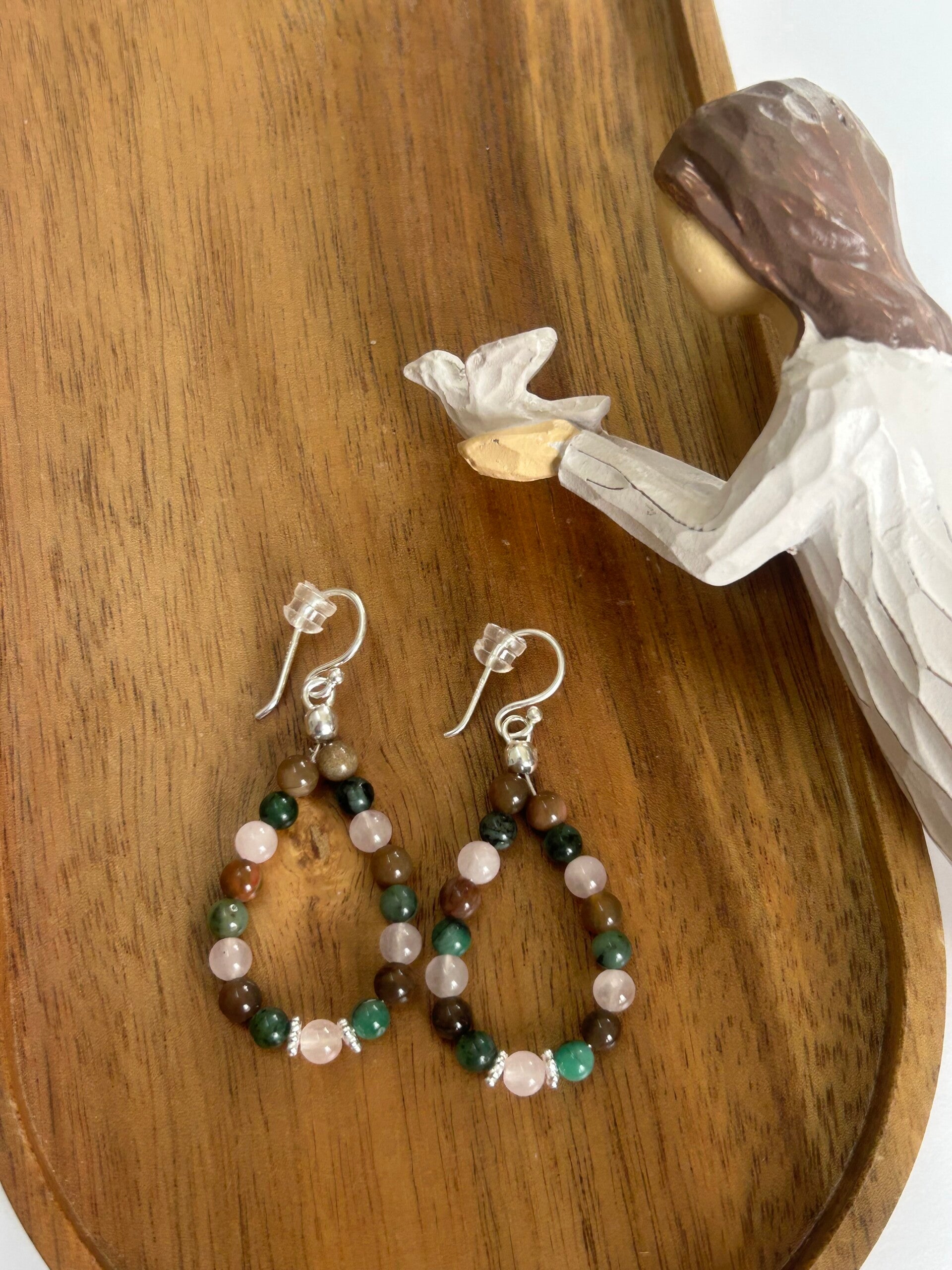 Ohrringe - Rosenquarz, Smaragd & Versteinertes Holz (O530)