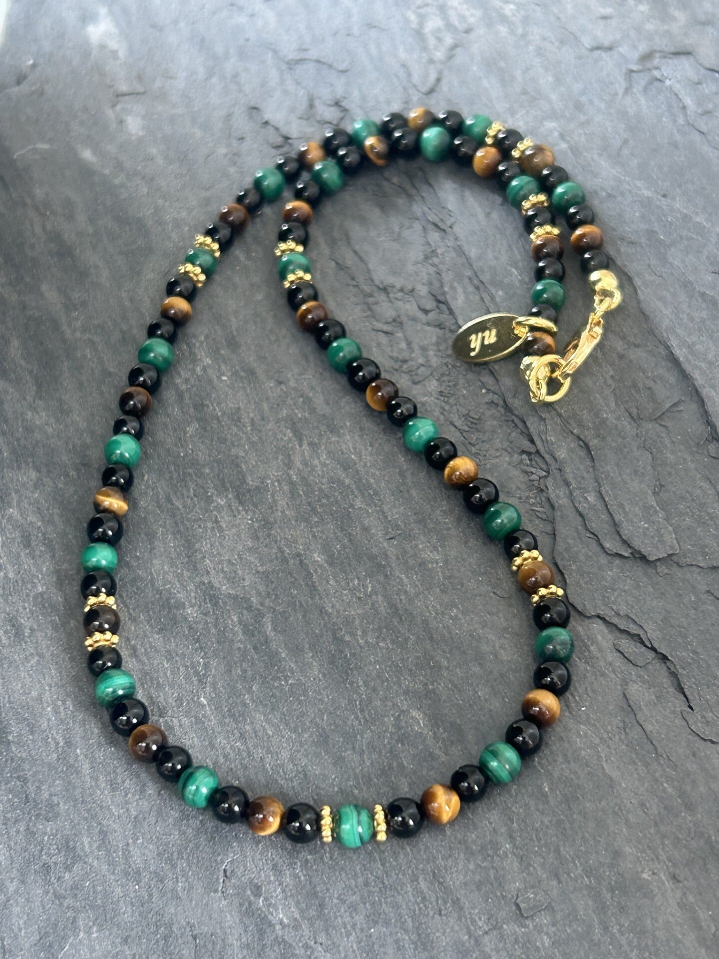 Heilsteine (Link zu Beschreibung und Wirkung): Malachit, Obsidian schwarz, Onyx, Tigerauge, Turmalin schwarz (Schörl)