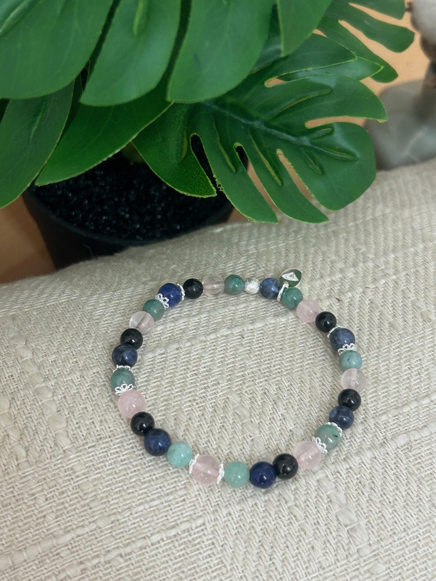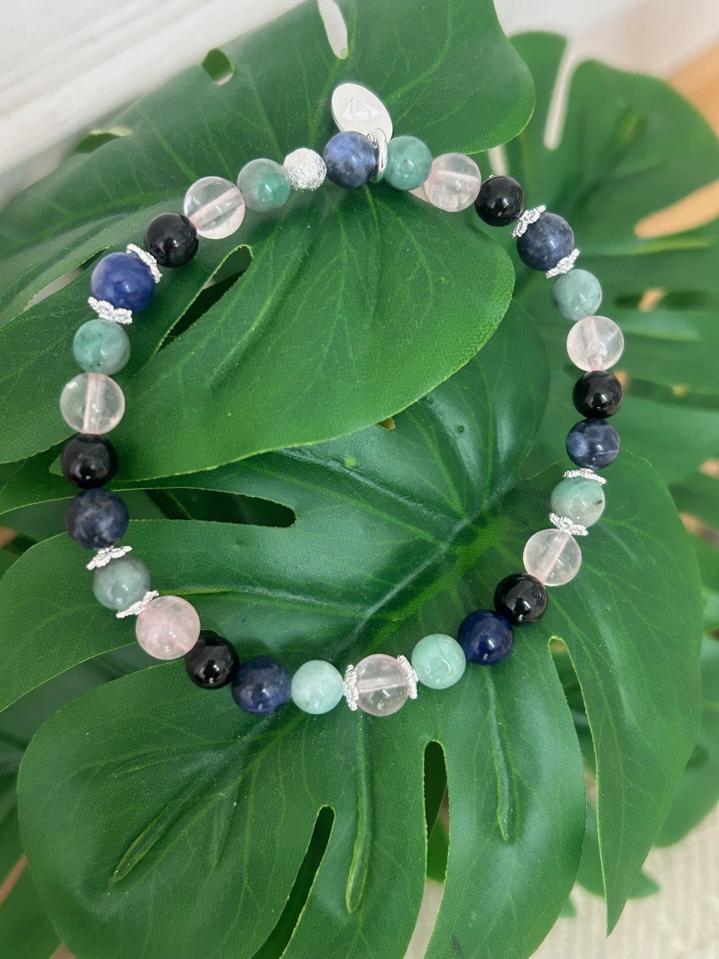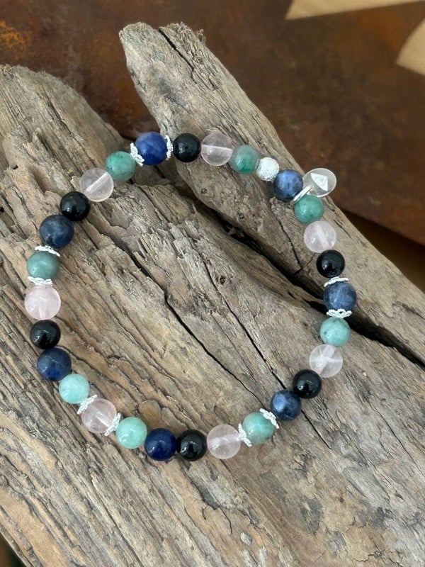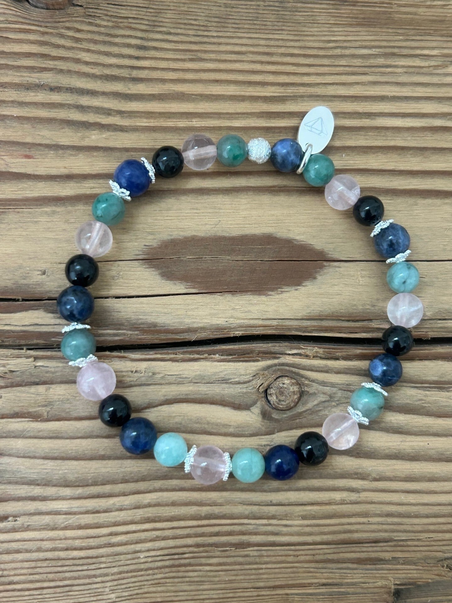 Heilsteine (Link zu Beschreibung und Wirkung): Rosenquarz, Smaragd (Beryll grün), Sodalith (blau), Turmalin schwarz (Schörl)