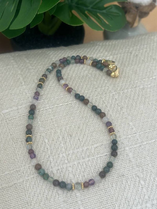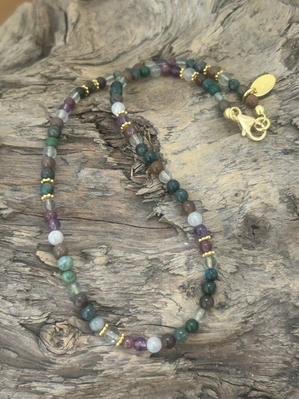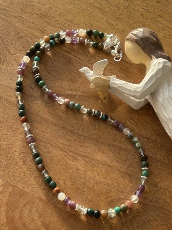 Heilsteine (Link zu Beschreibung und Wirkung): Amethyst, Chrysokoll, Fluorit, Lepidolith, Mondstein, Ozean-Achat, Versteinertes Holz