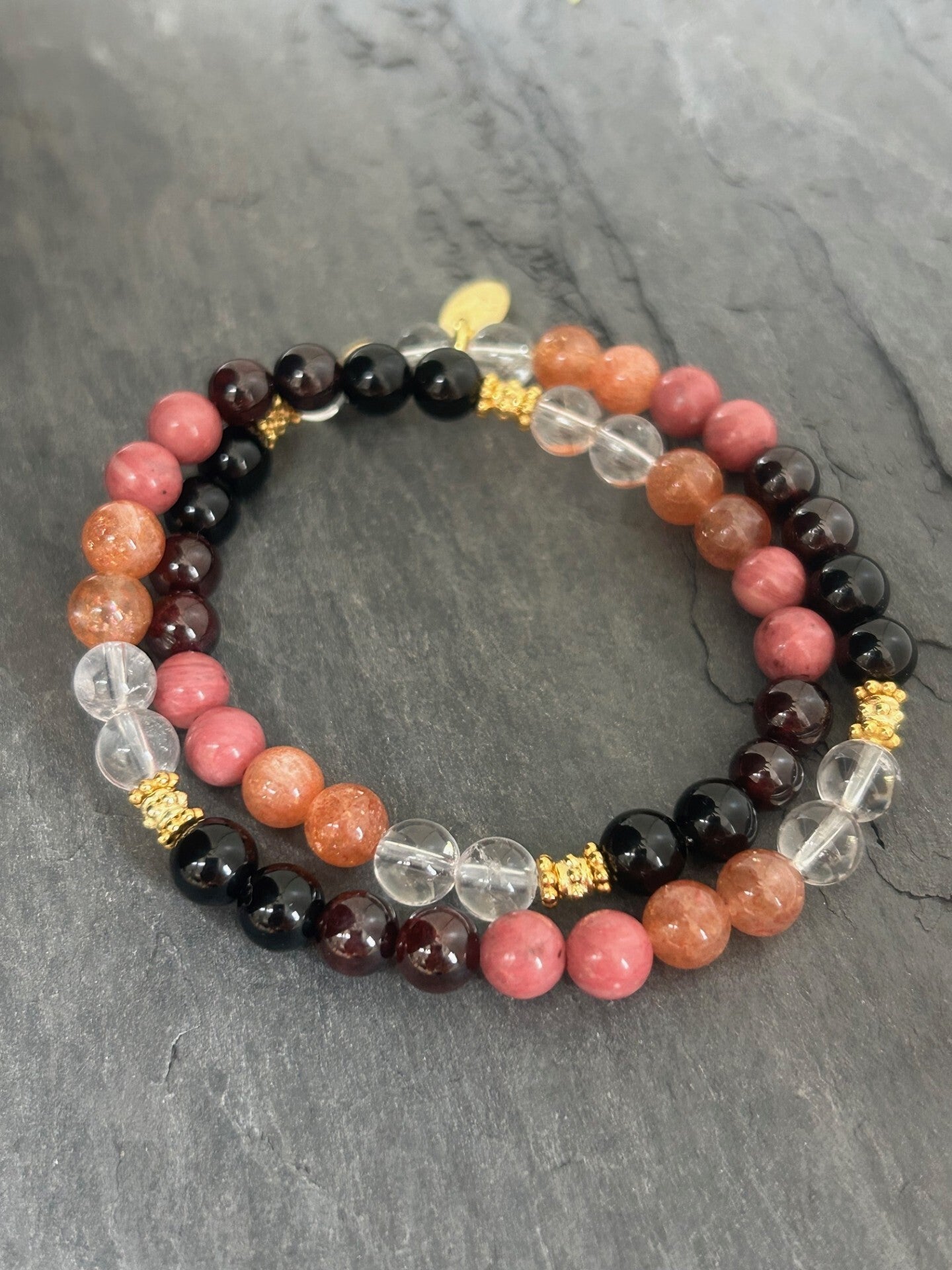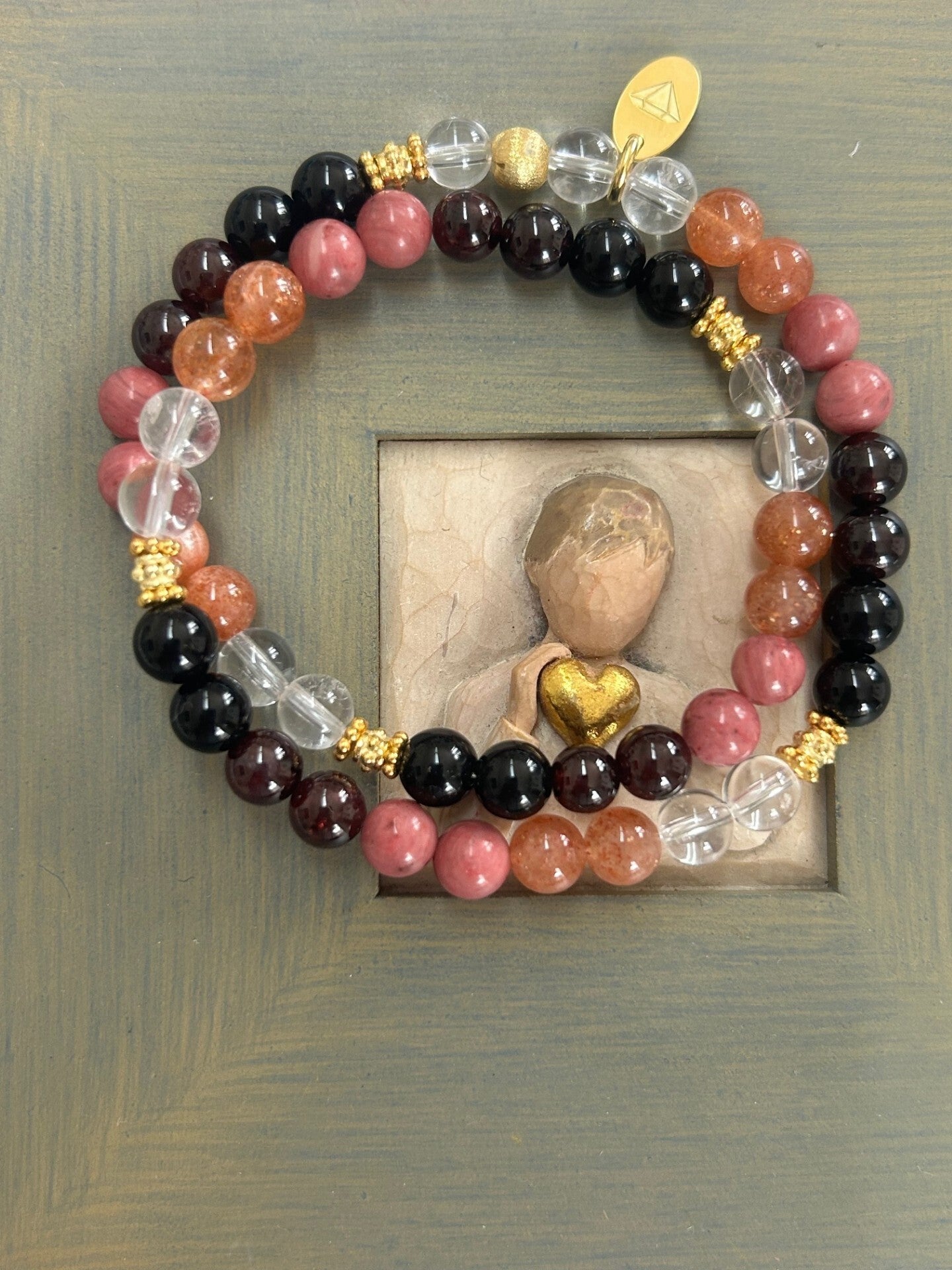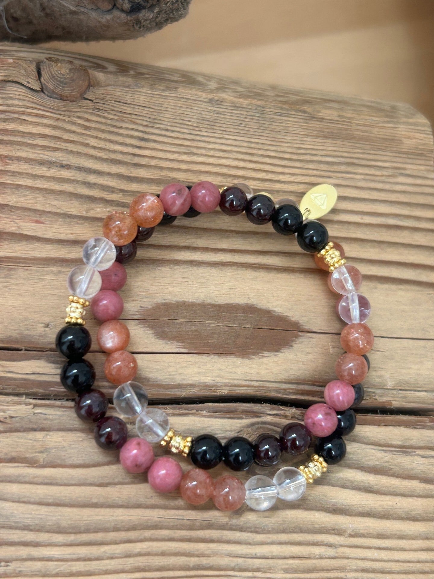 Heilsteine (Link zu Beschreibung und Wirkung): Bergkristall, Granat, Obsidian schwarz, Rhodonit, Sonnenstein