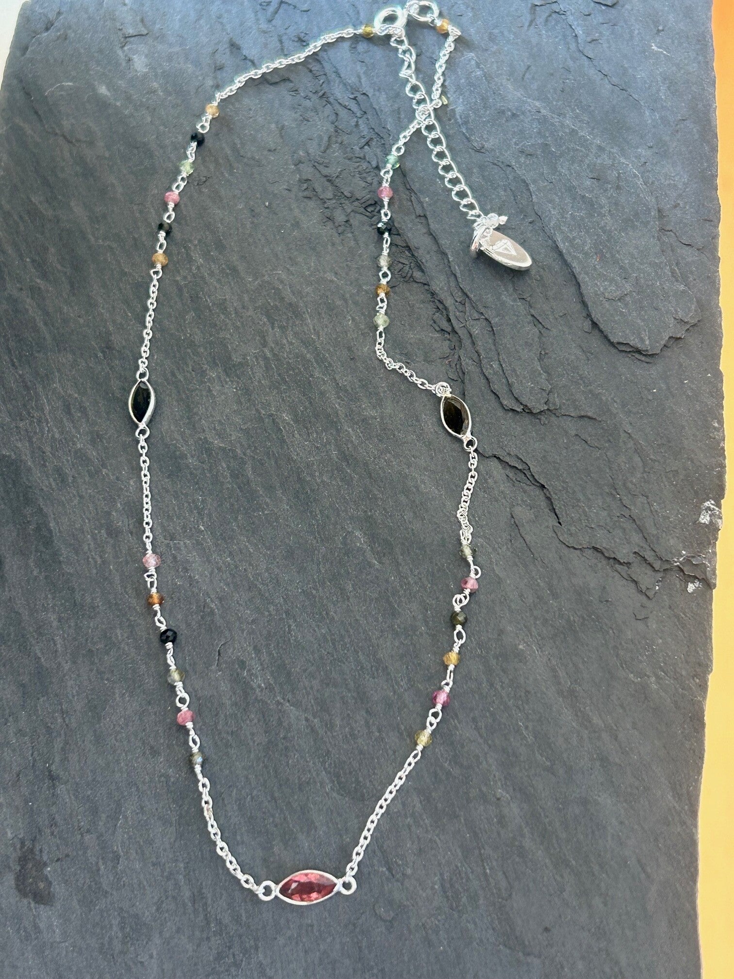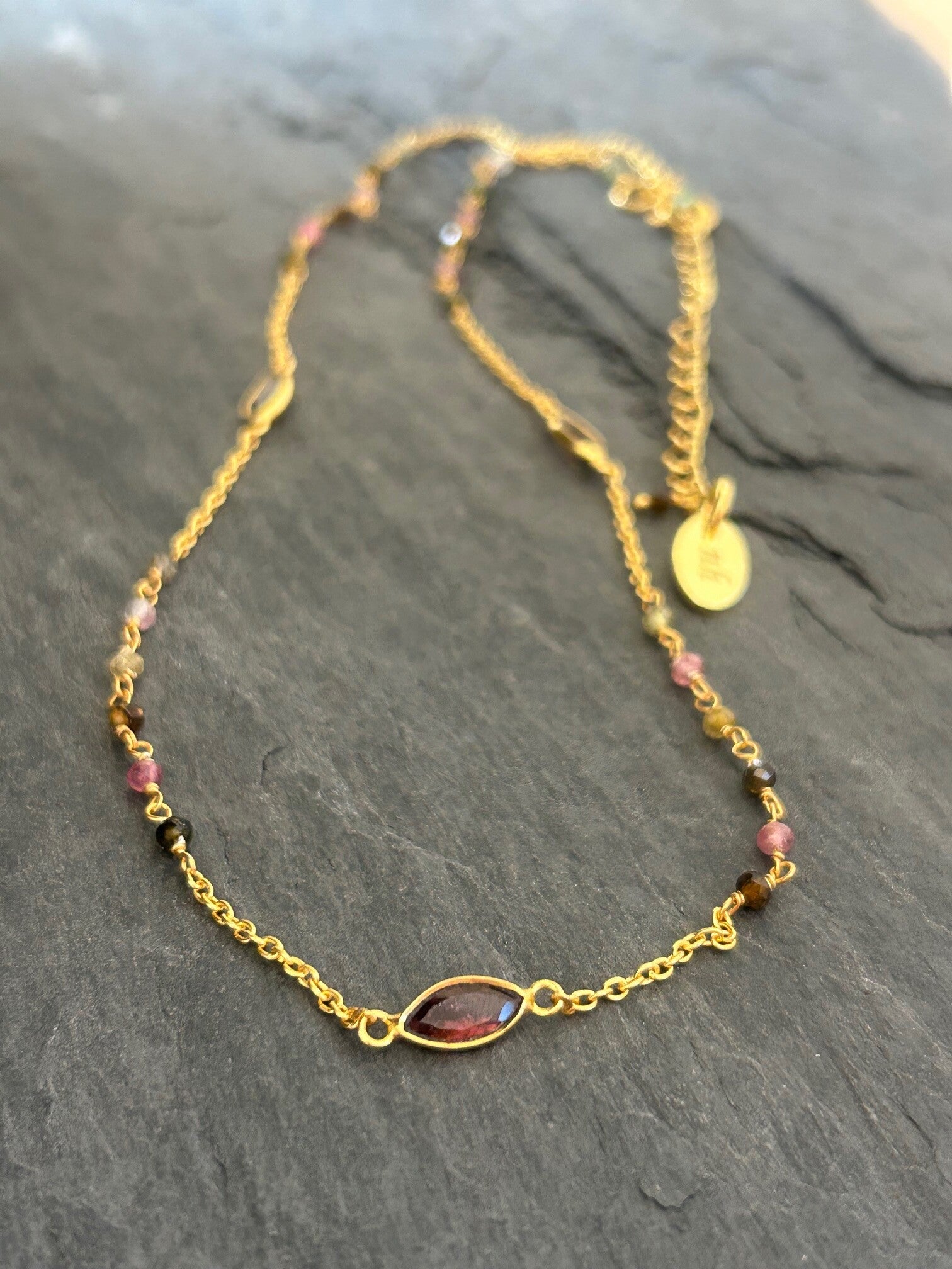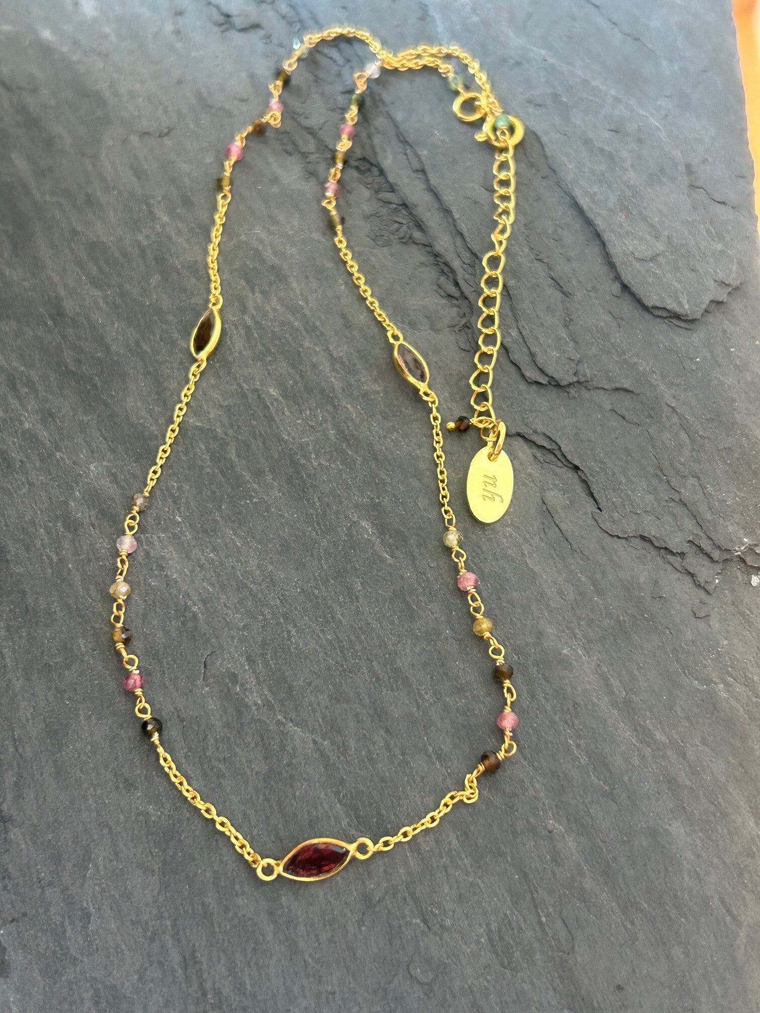 Länge: 41cm (+ 5cm-Verlängerungsstück); Silber 925 vergoldete respektive Silber 925 wählbar; 5 x 9mm facettierter Turmalin bunt, 2mm facettierter Turmalin bunt