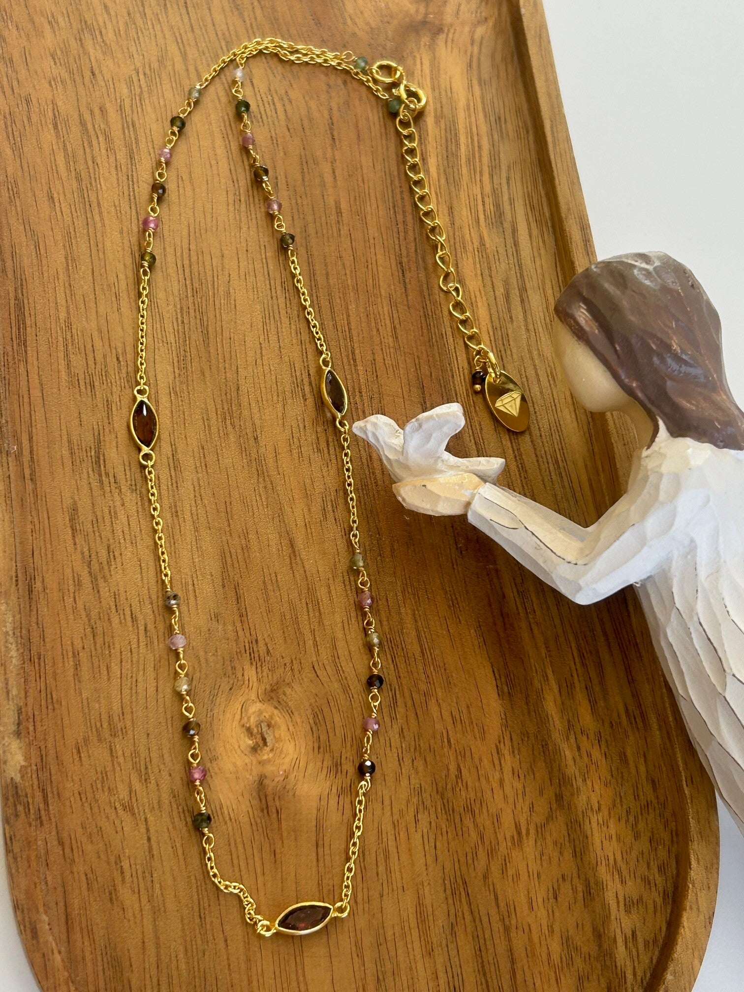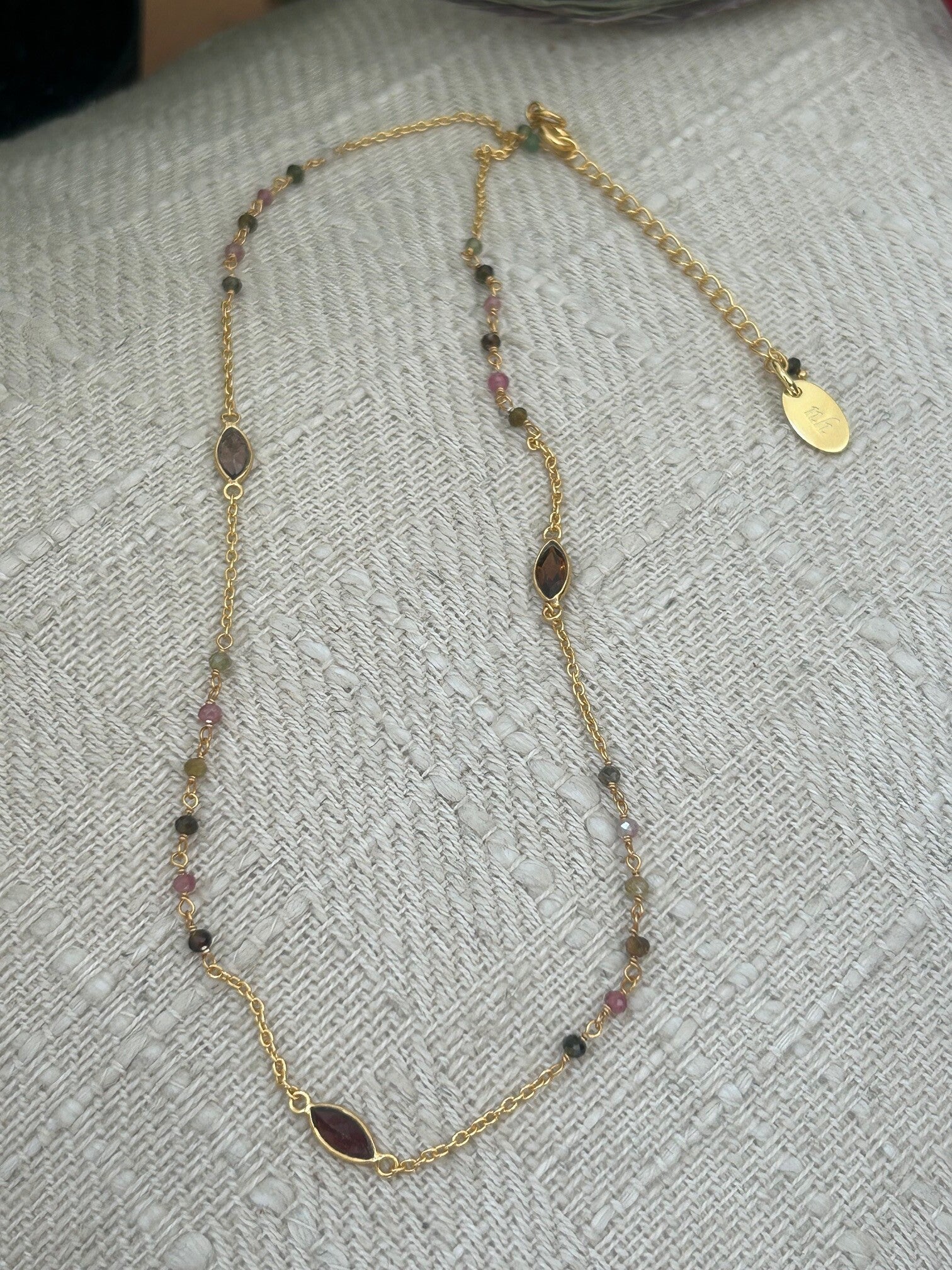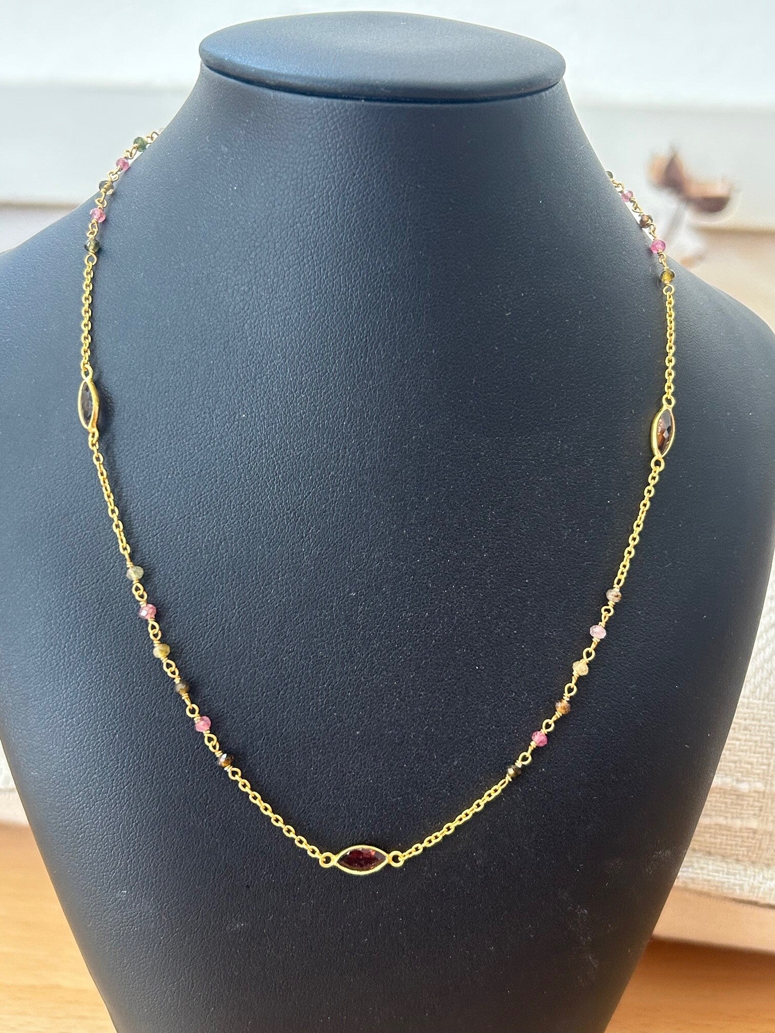 Länge: 41cm (+ 5cm-Verlängerungsstück); Silber 925 vergoldete respektive Silber 925 wählbar; 5 x 9mm facettierter Turmalin bunt, 2mm facettierter Turmalin bunt