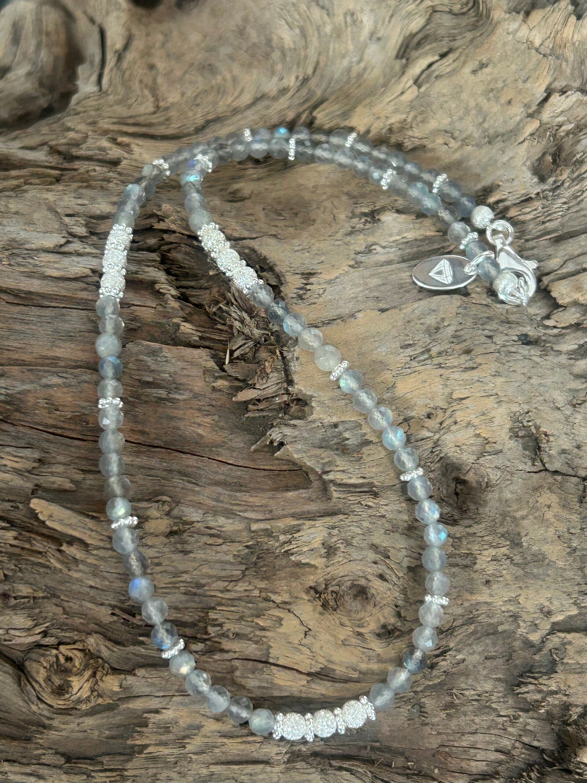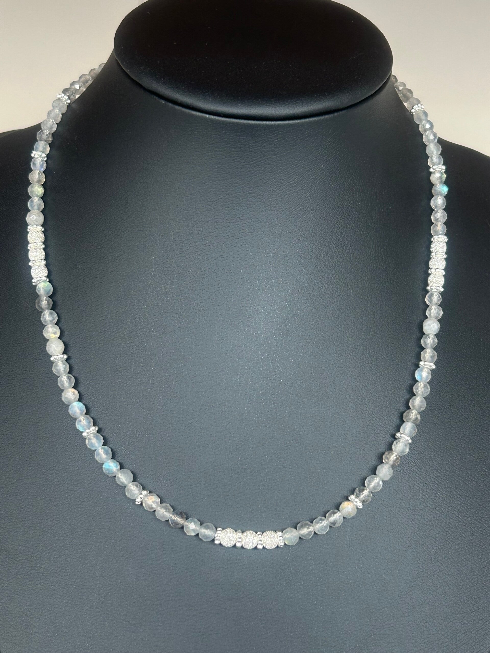 Länge auf diesem Bild: 42cm (Deine genaue Wunschlänge im Kommentar eintragen und die entsprechende Preisklasse wählen); Silber 925 diamantierte Kugeln, Silber 925 Elemente; Kugeln 4mm facettiert