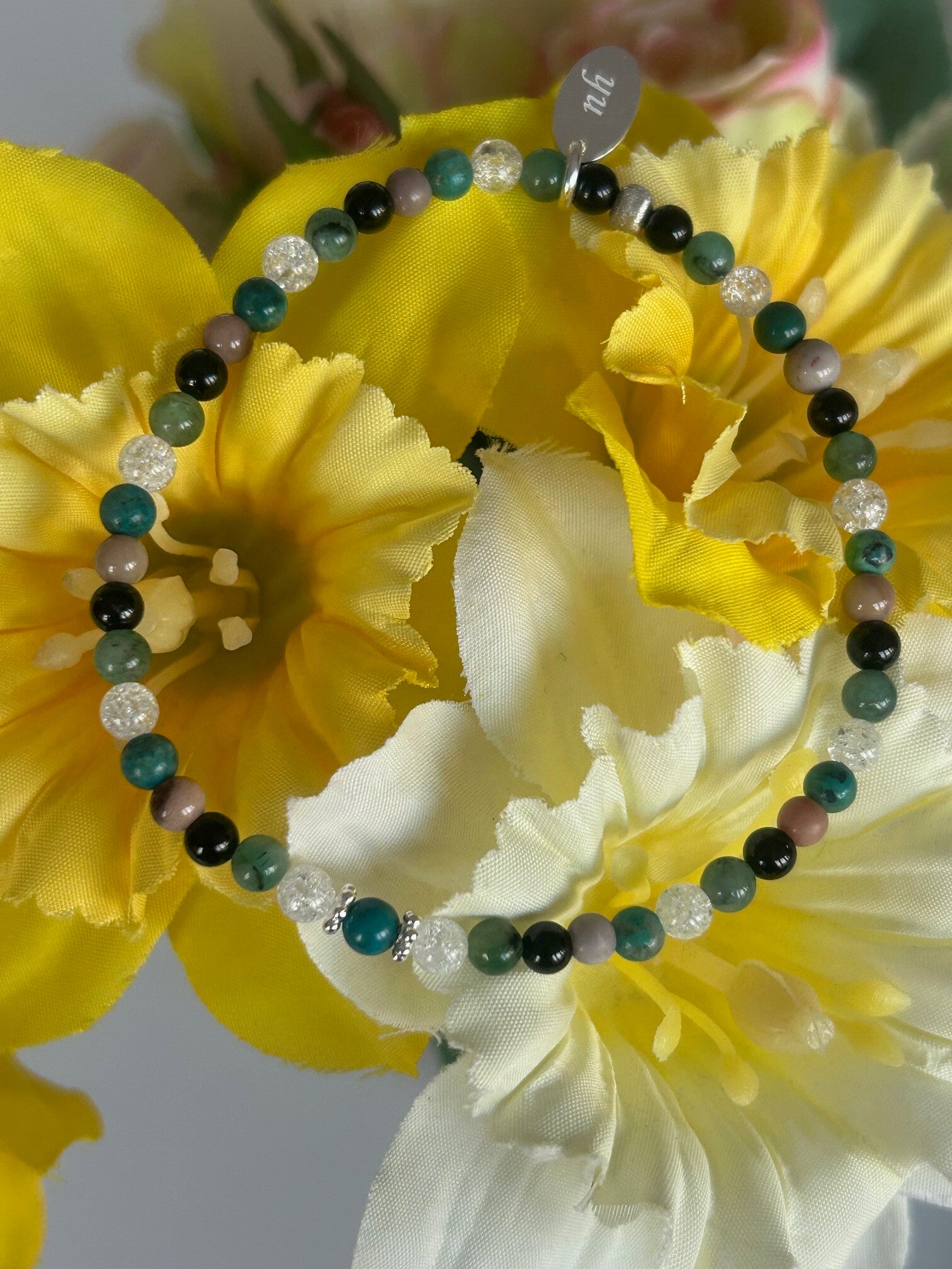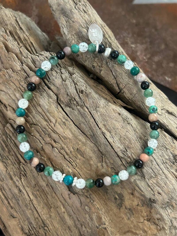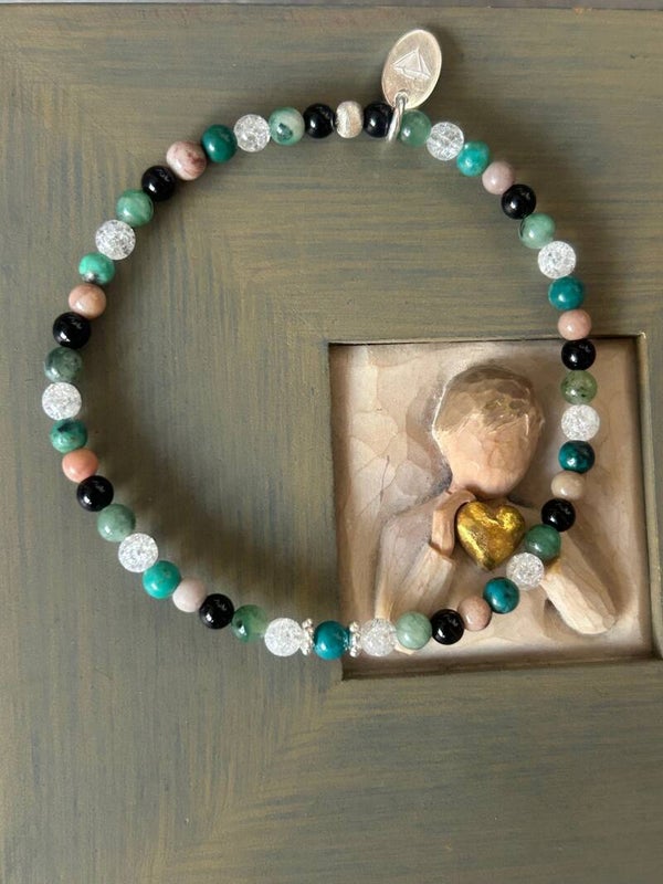 Heilstein (Link zu Beschreibung und Wirkung): Bergkristall Iris, Chrysokoll, Smaragd (Beryll grün), Turmalin schwarz (Schörl), Versteinertes Holz