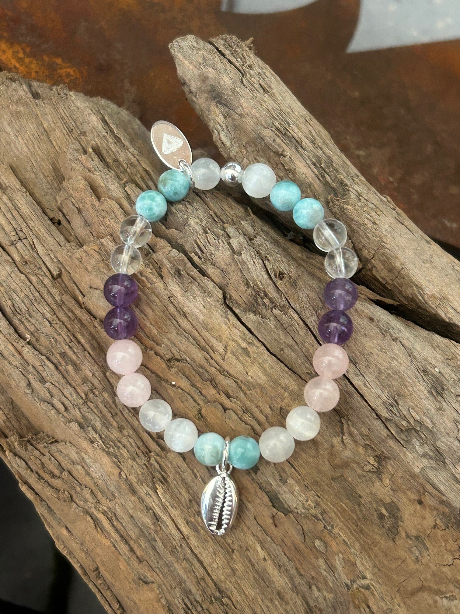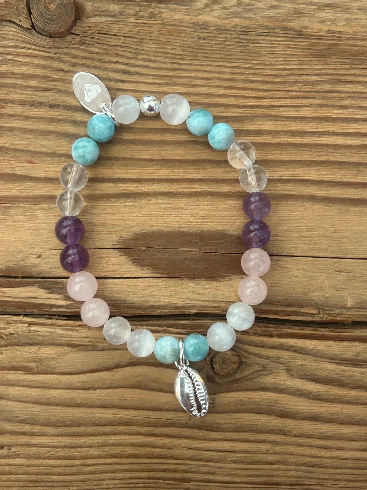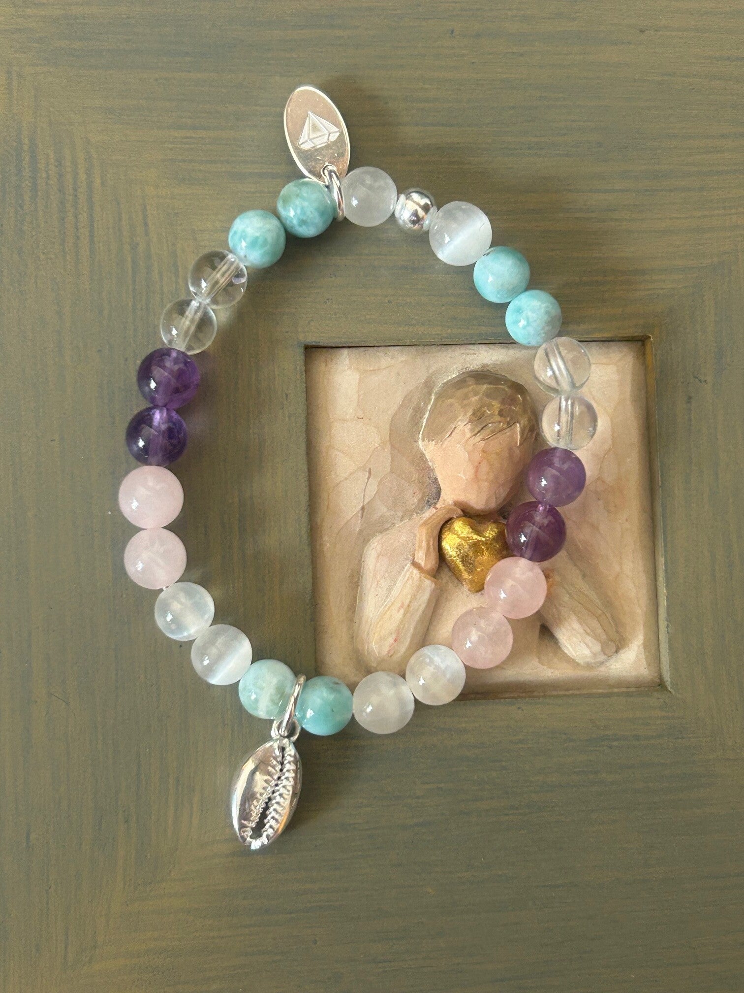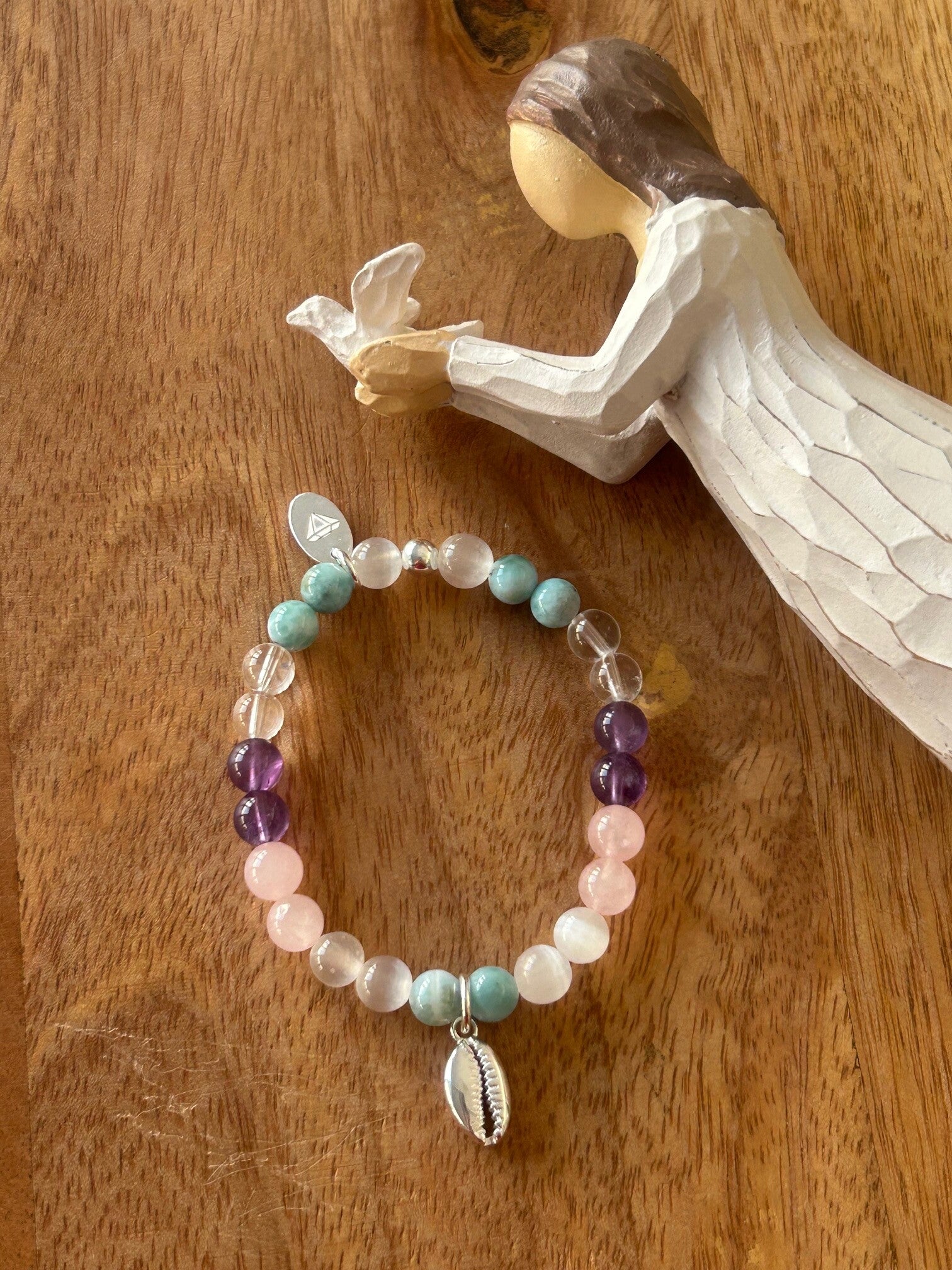 Heilsteine (Link zu Beschreibung und Wirkung): Amethyst, Bergkristall, Larimar, Rosenquarz, Selenit
