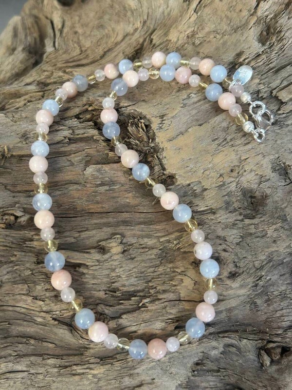 Heilsteine (Link zu Beschreibung und Wirkung): Andenopal rosa, Chalcedon blau, Citrin, Rosenquarz