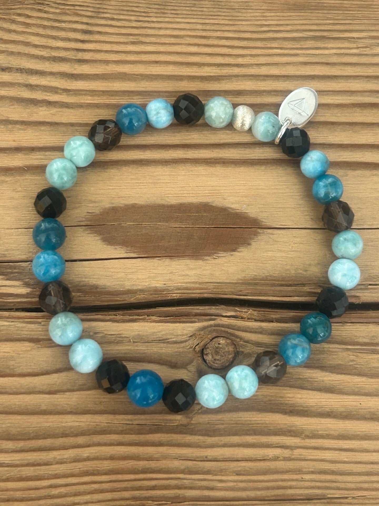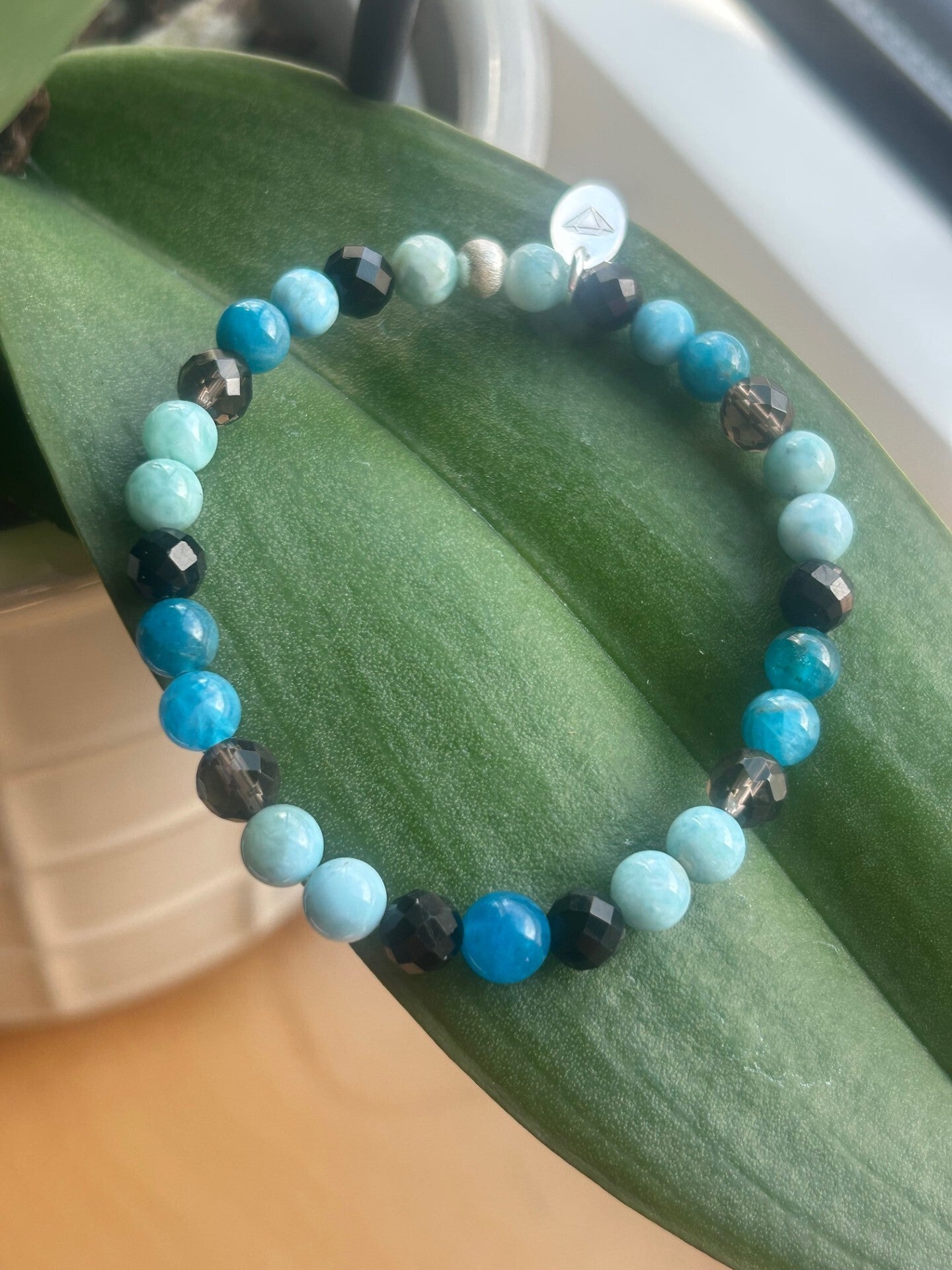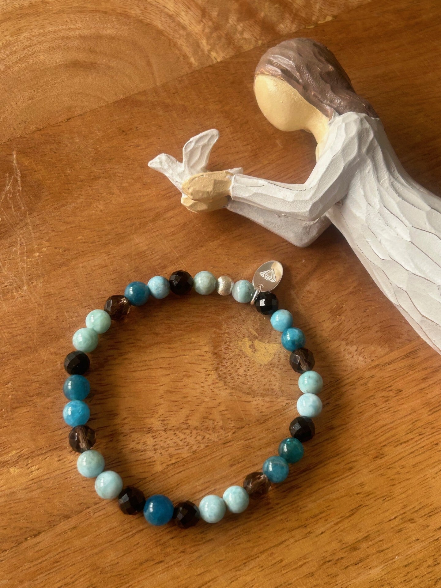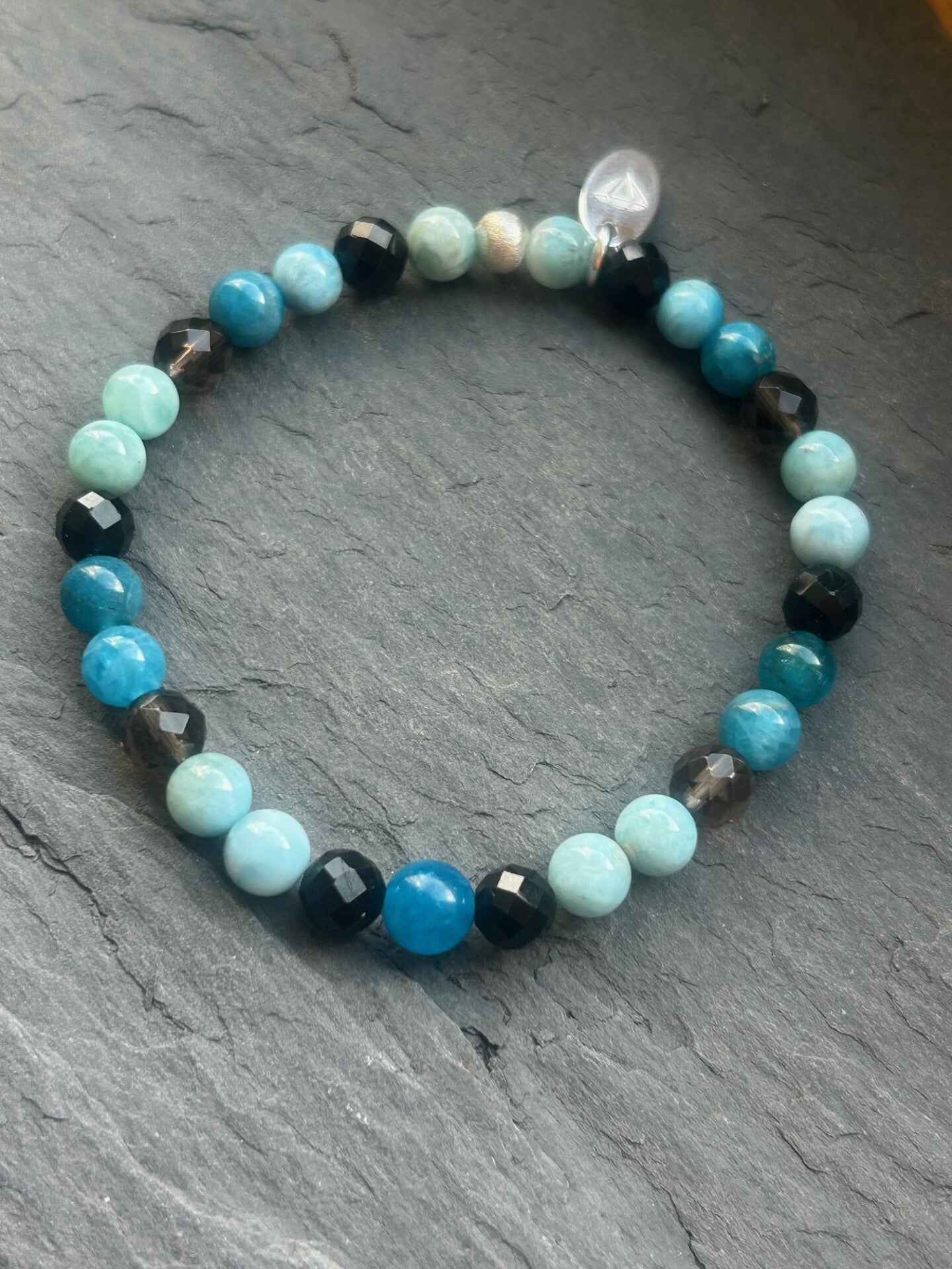 Heilsteine (Link zu Beschreibung und Wirkung): Apatit blau, Larimar, Rauchquarz, Turmalin schwarz (Schörl)