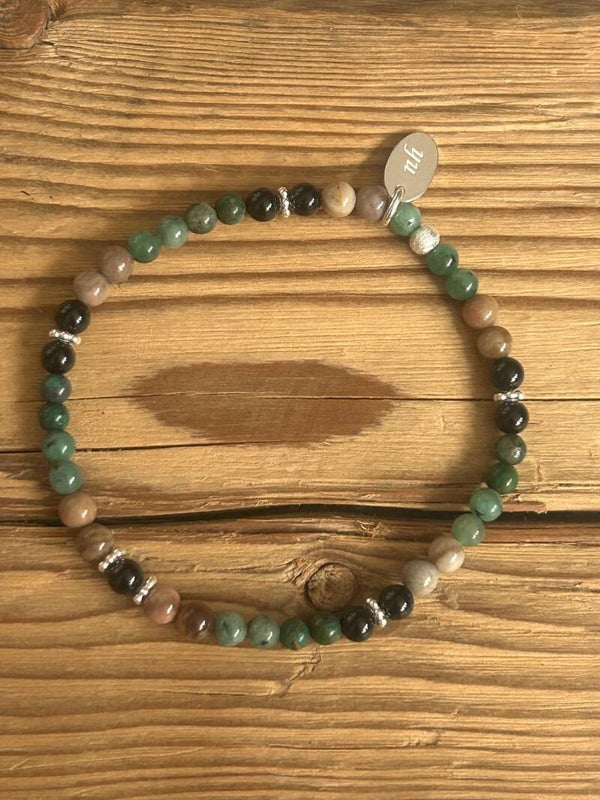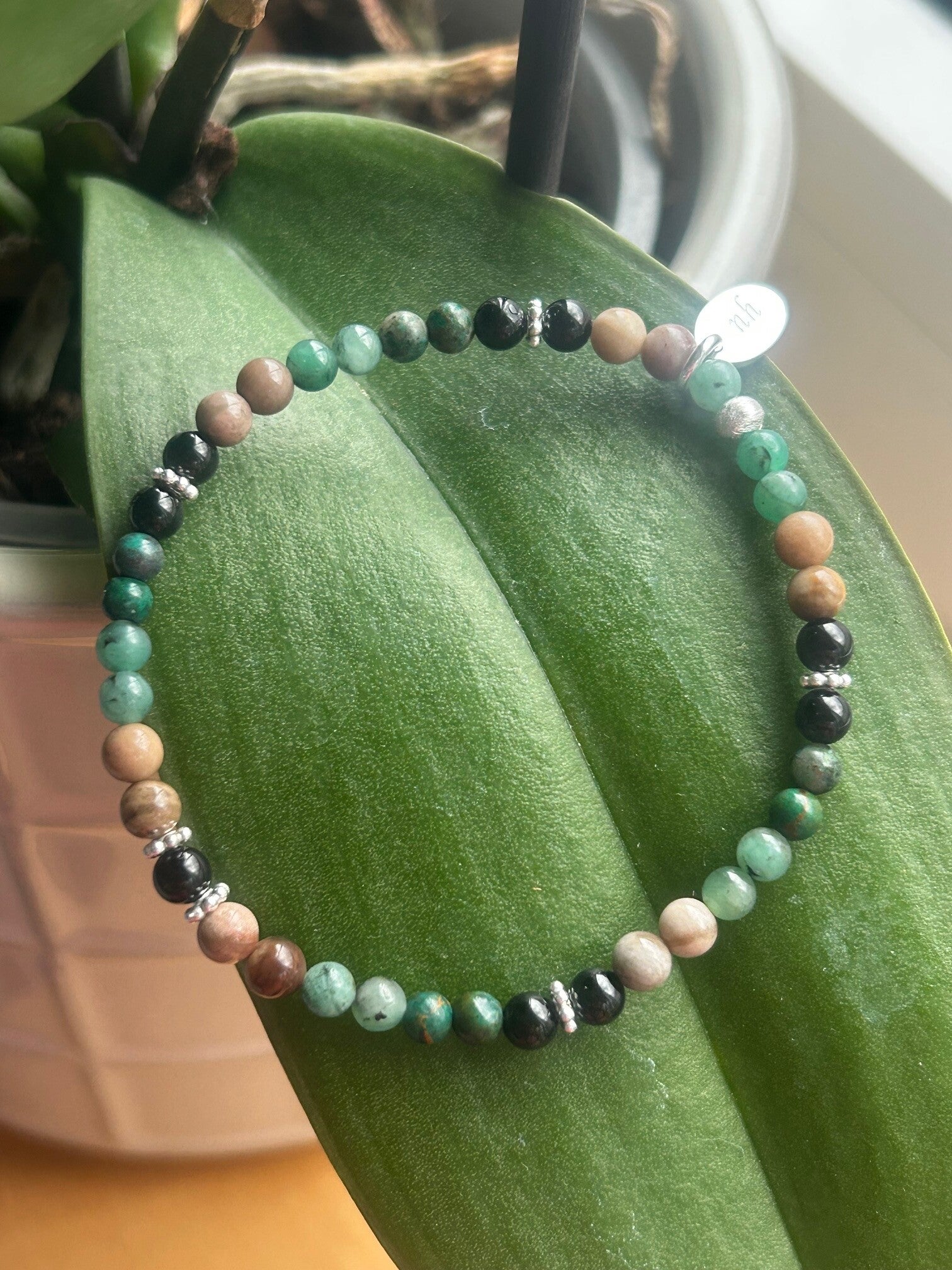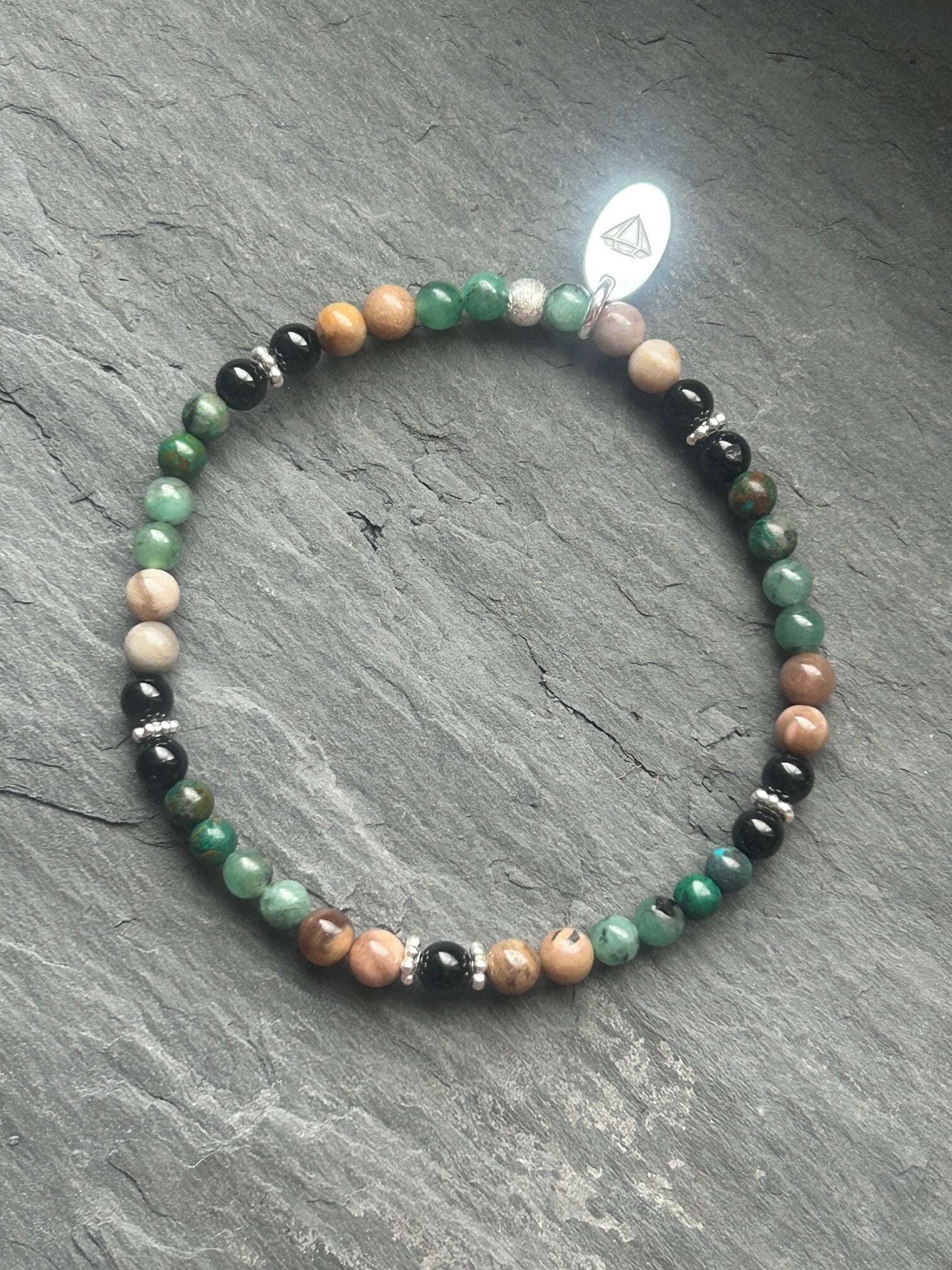 Heilsteine (Link zu Beschreibung und Wirkung): Chrysokoll, Smaragd (Beryll grün), Turmalin schwarz (Schörl), Versteinertes Holz