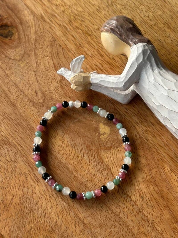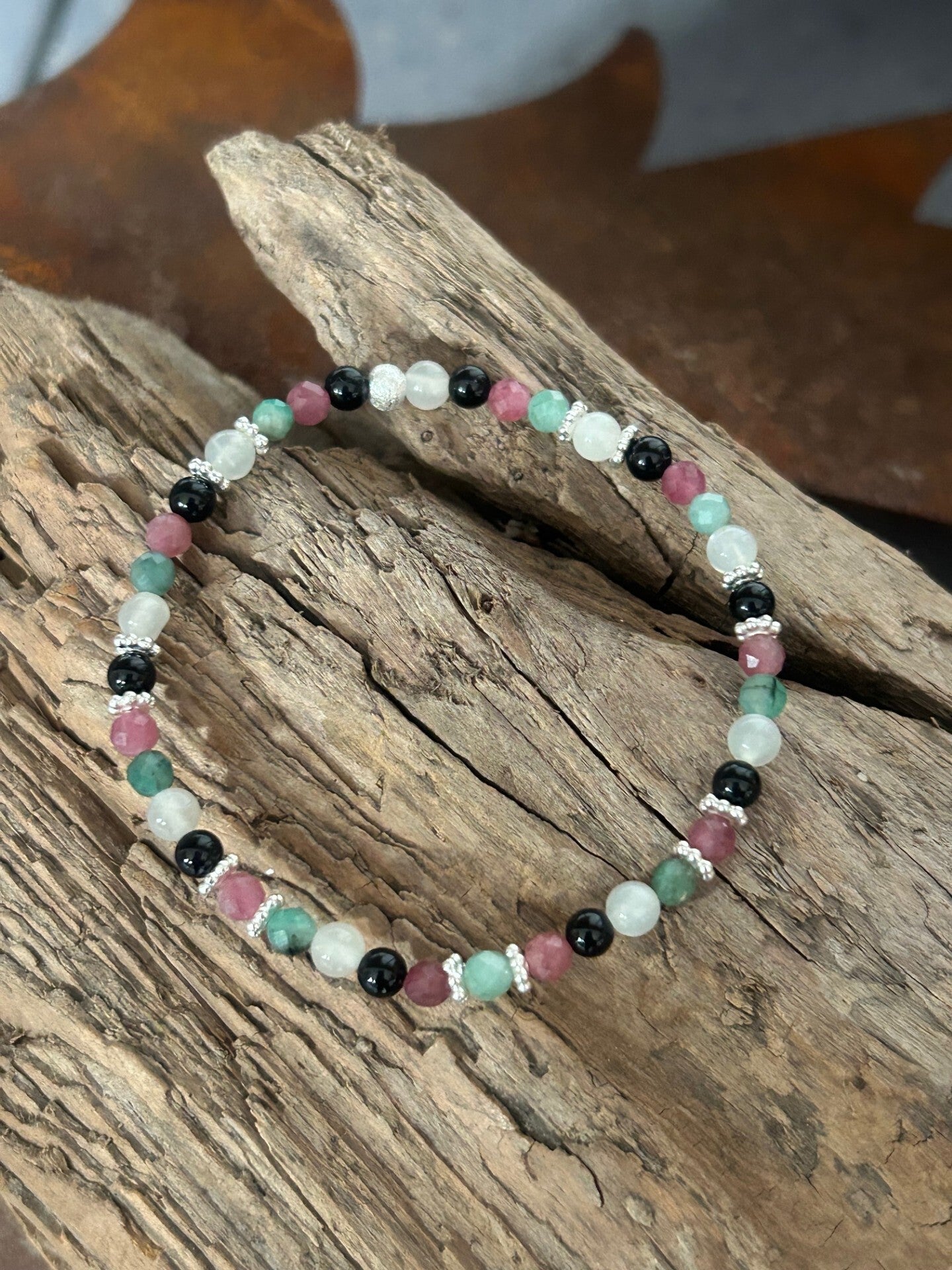 Heilsteine (Link zu Beschreibung und Wirkung): Mondstein weiss, Smaragd (Beryll grün); Turmalin rosa (Rubellit); Turmalin schwarz (Schörl)