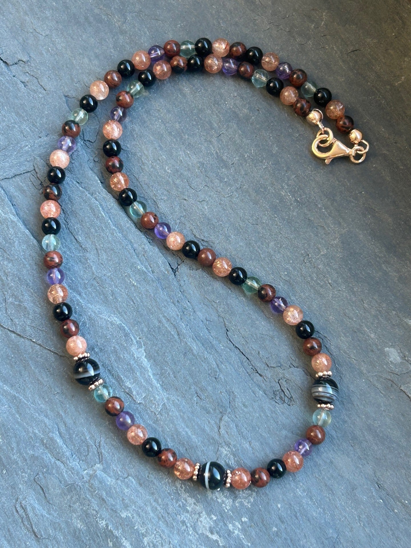 Heilsteine (Link zu Beschreibung und Wirkung): Amethyst, Fluorit, Mahagoni-Obsidian, Onyx, Sardonyx, Sonnenstein
