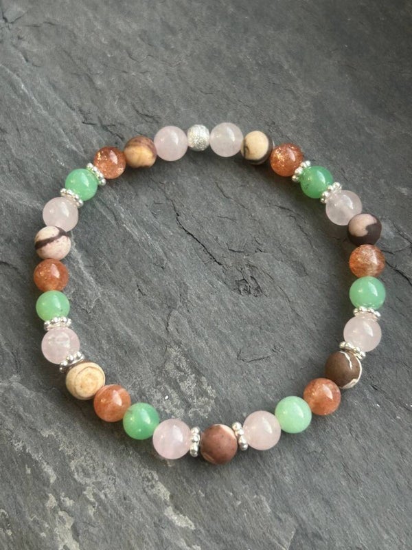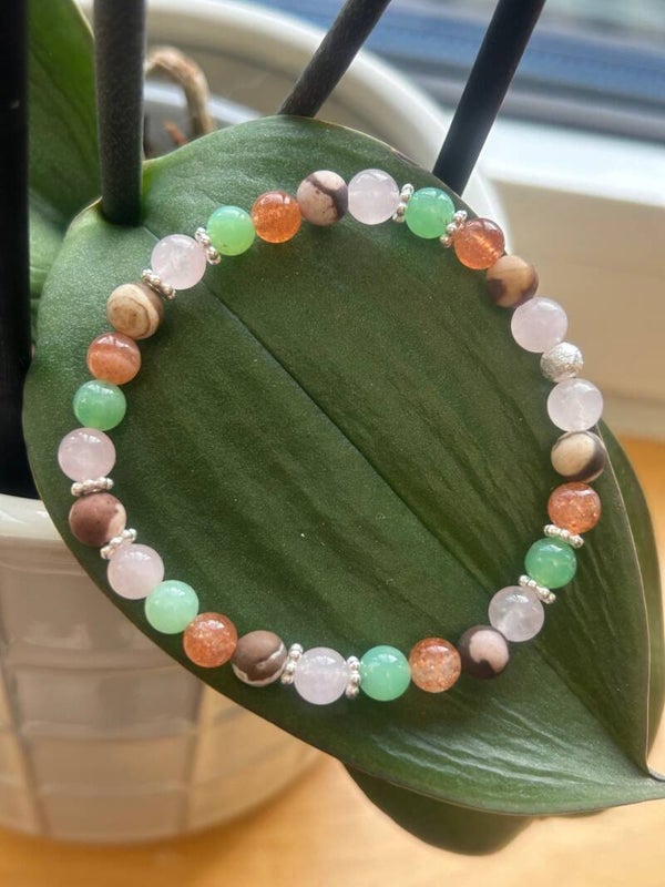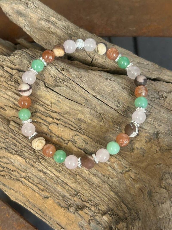 Heilsteine (Link zu Beschreibung und Wirkung): Chrysopras, Rosenquarz, Sonnenstein, Zebra-Jaspis