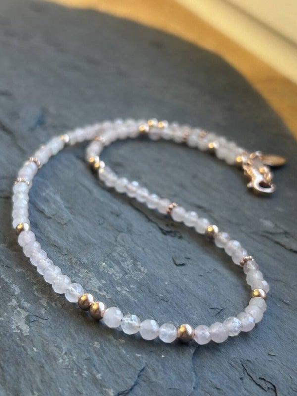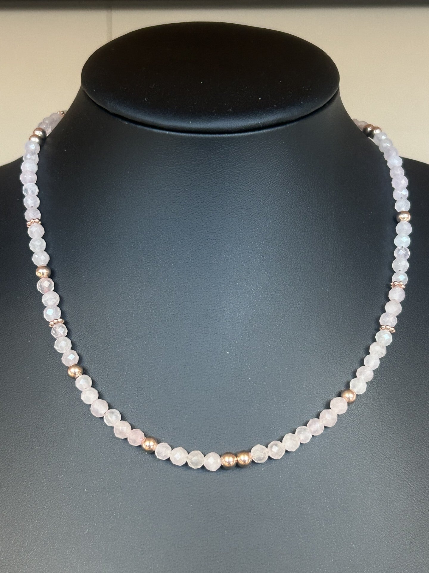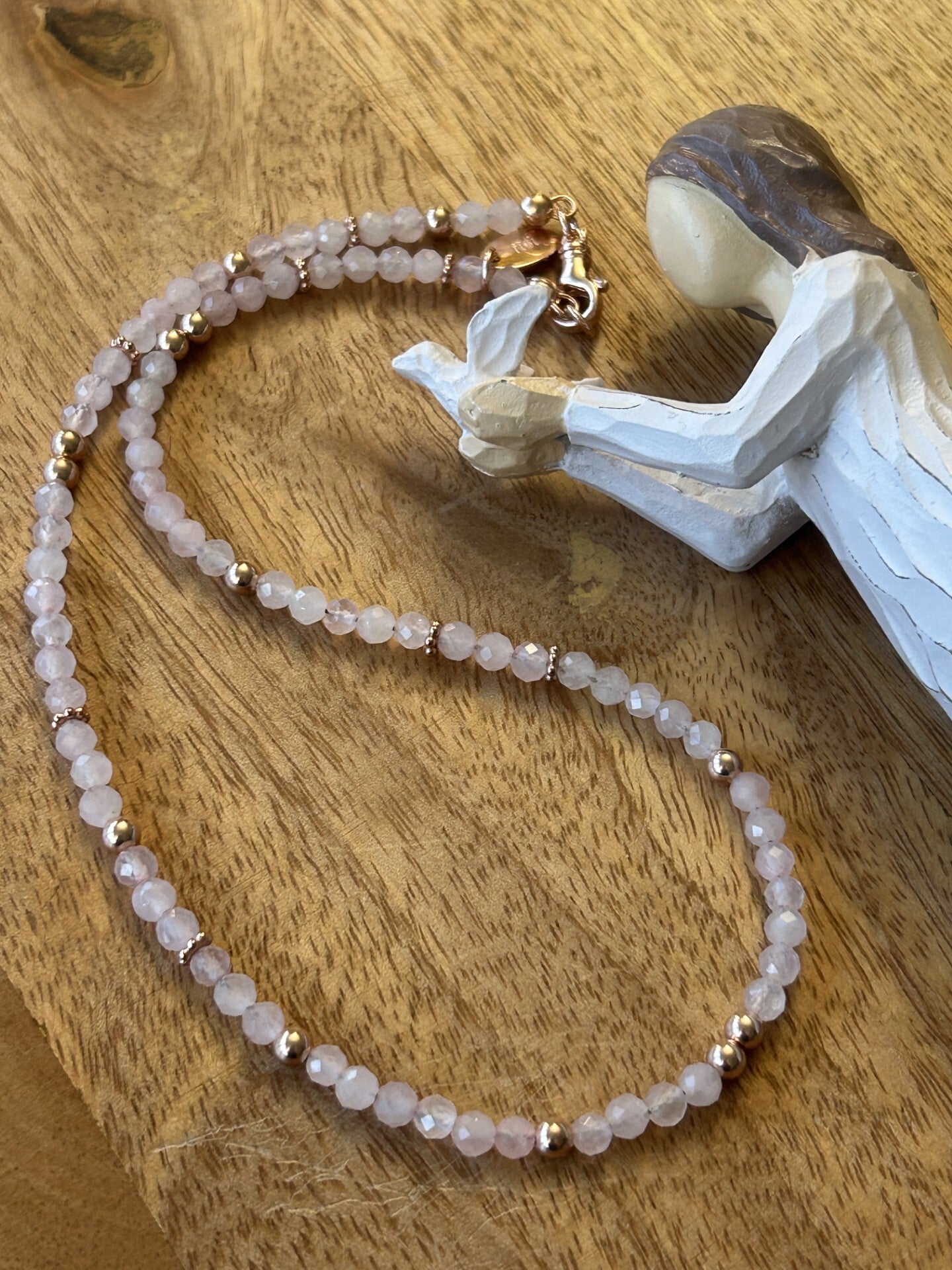Länge auf diesem Bild: 40cm (Deine genaue Wunschlänge im Kommentar eintragen und die entsprechende Preisklasse wählen); Silber 925 rosé vergoldete Elemente und Verschluss; Kugeln 4mm facettiert