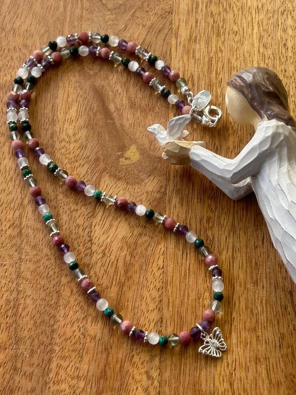 Heilsteine (Link zu Beschreibung und Wirkung): Amethyst, Chrysokoll, Fluorit, Rhodonit, Selenit