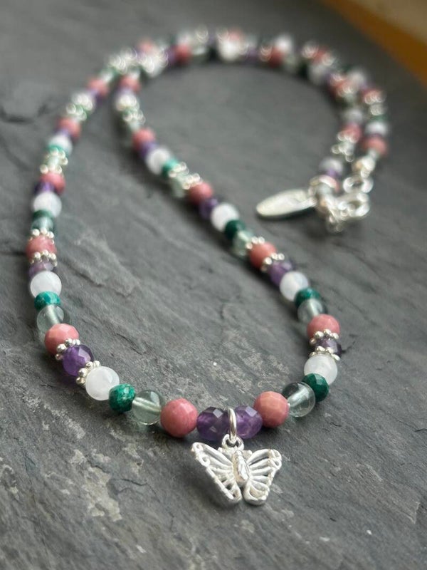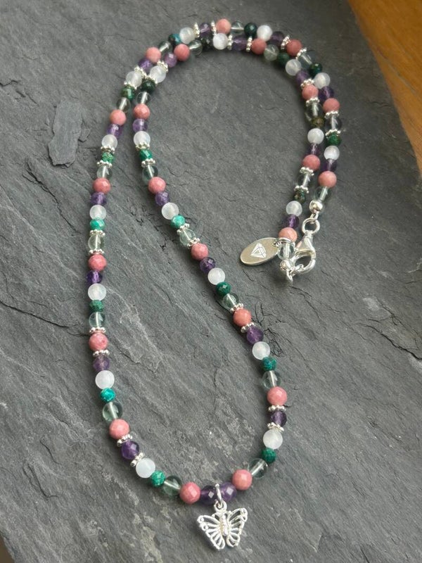 Länge auf diesem Bild: 50cm (Deine genaue Wunschlänge im Kommentar eintragen und die entsprechende Preisklasse wählen); Silber 925 Anhänger "Schmetterling", Elemente und Verschluss; Kugeln 4mm und 4mm facettiert