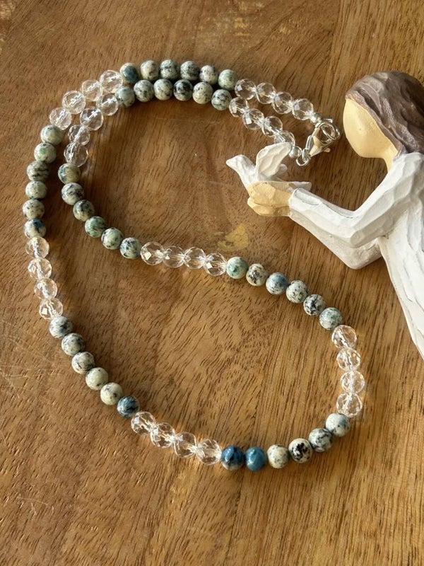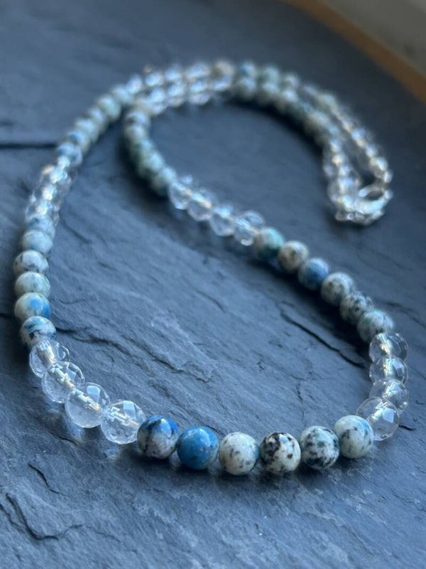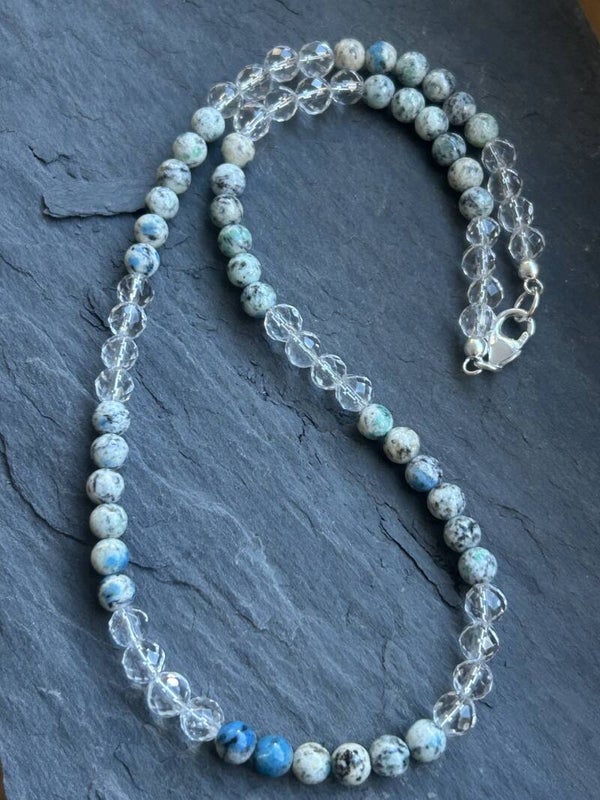 Heilsteine (Link zu Beschreibung und Wirkung): Bergkristall, K2 (Granit mit Azurit)