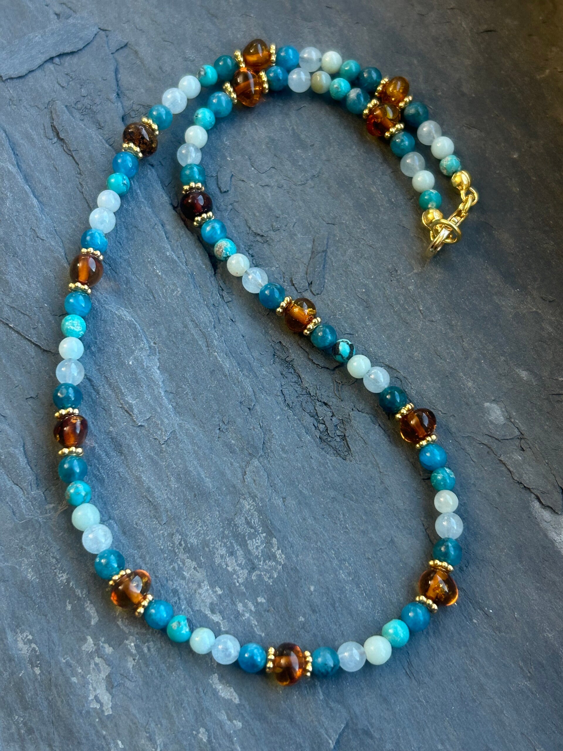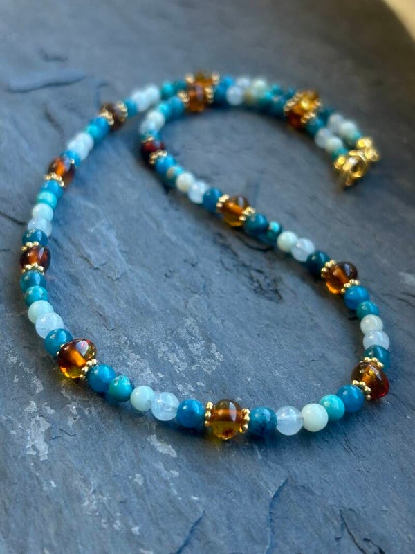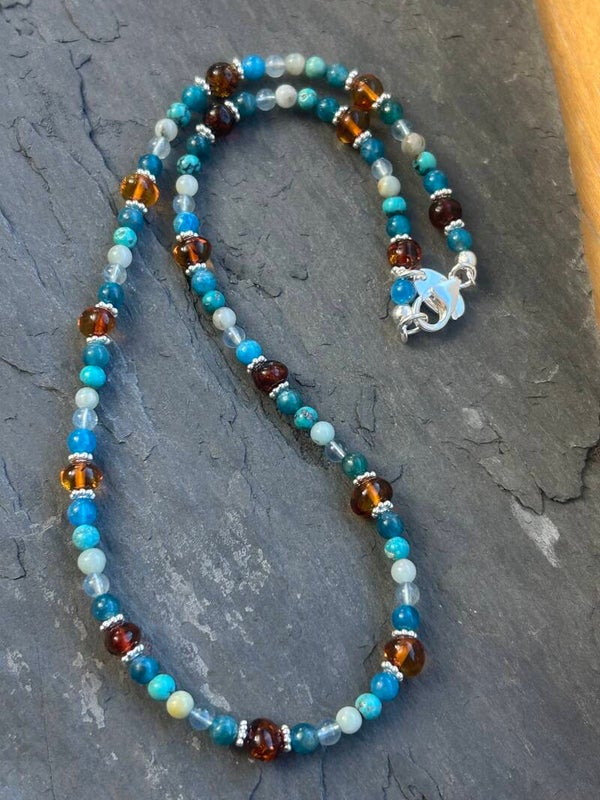 Heilsteine (Link zu Beschreibung und Wirkung: Amazonit, Apatit blau, Bernstein Barock, Beryll blau (Aquamarin), Türkis