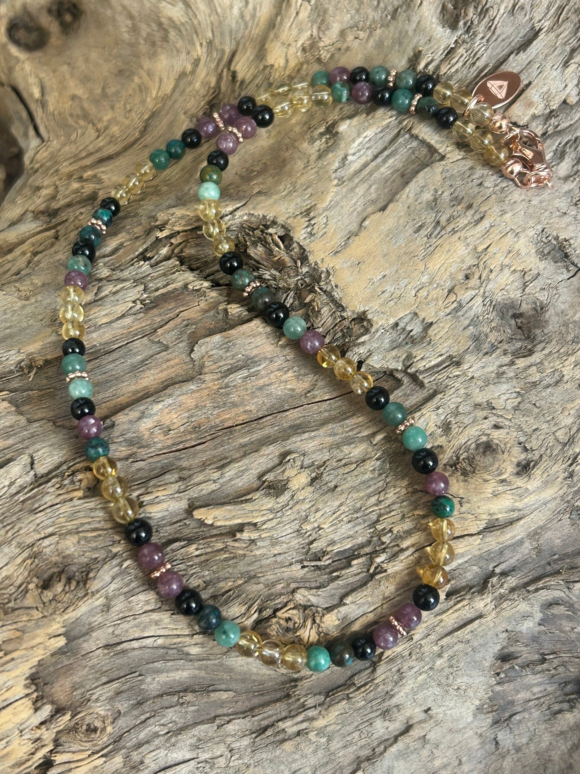 Heilsteine (Link zu Beschreibung und Wirkung): Citrin, Chrysokoll, Lepidolith, Smaragd (Beryll grün), Turmalin schwarz (Schörl)