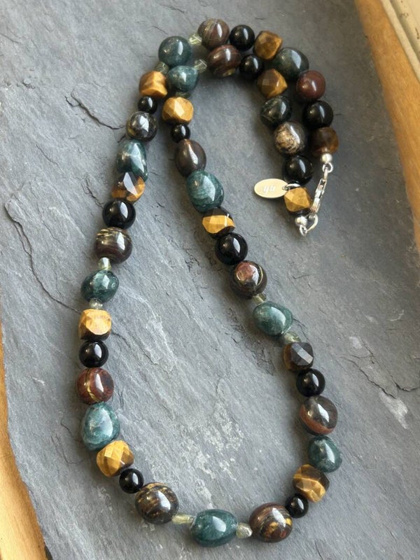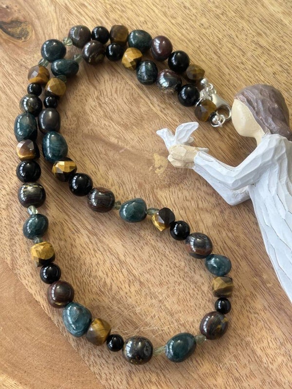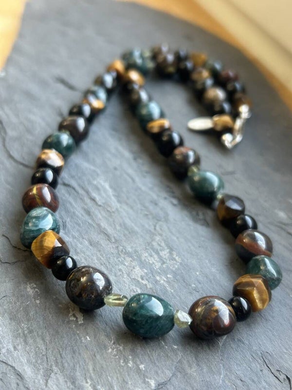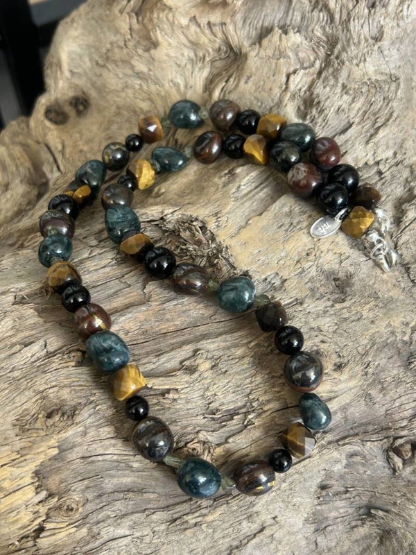 Heilsteine (Link zu Beschreibung und Wirkung): Apatit blau, Apatit grün (Beschreibung folgt), Obsidian schwarz, Tigerauge, Tigereisen
