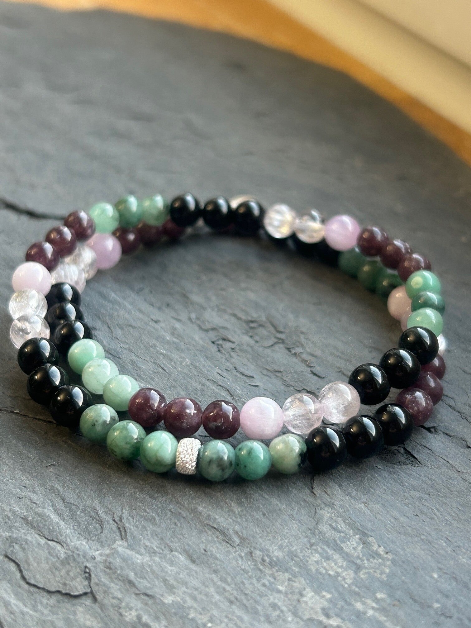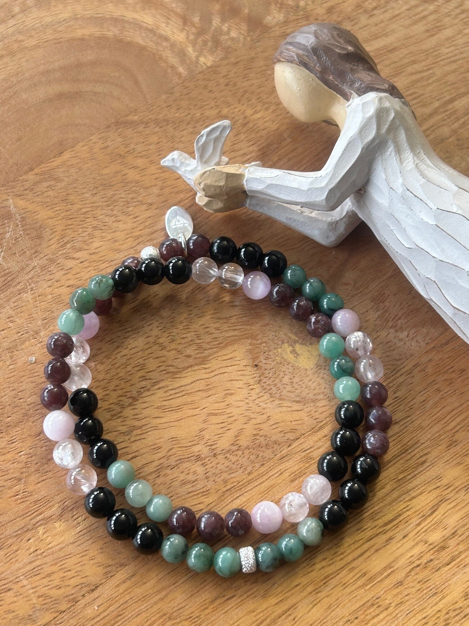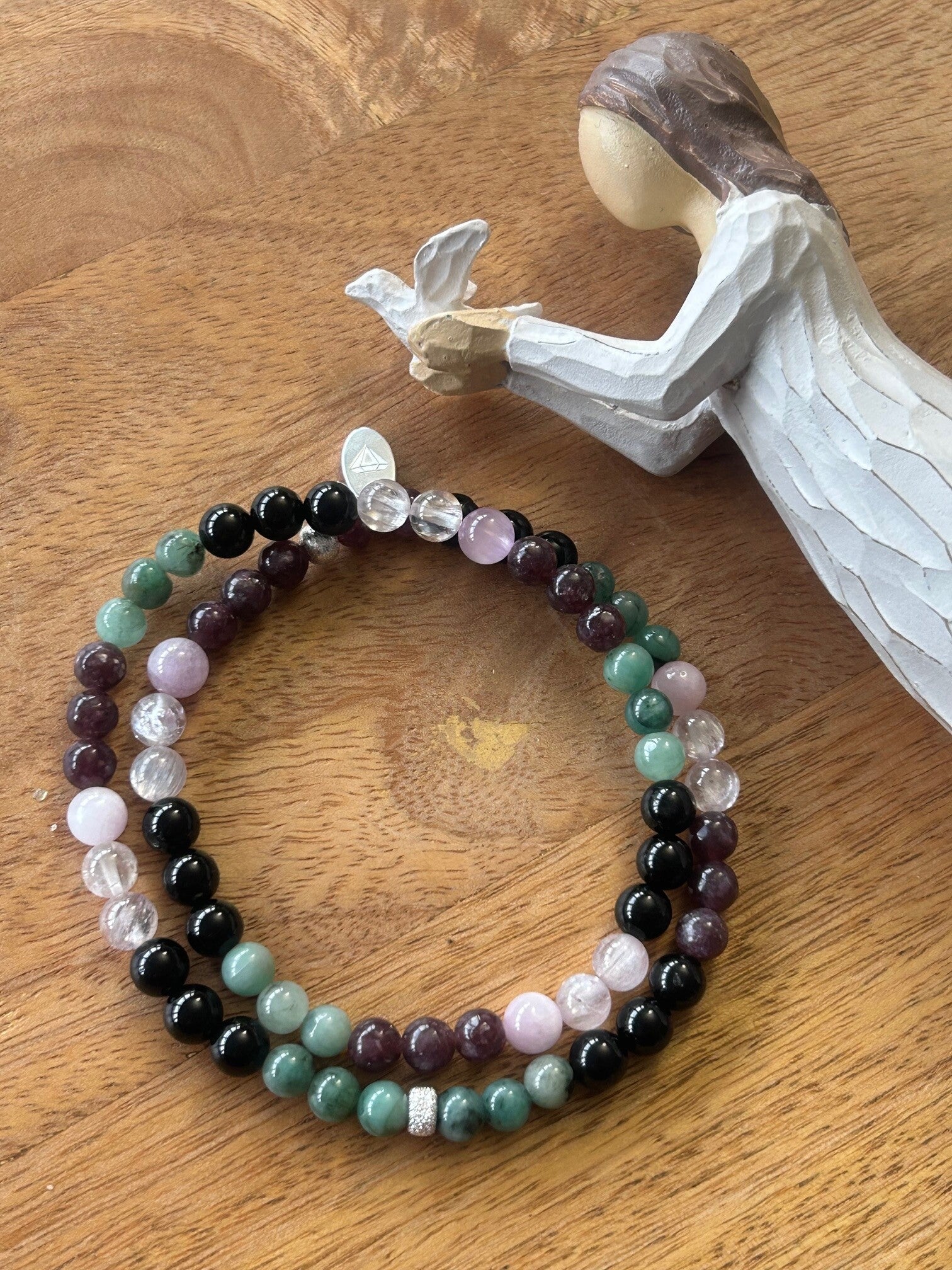 Heilsteine (Link zu Beschreibung und Wirkung): Kunzit, Lepidolith, Smaragd (Beryll grün), Turmalin schwarz (Schörl)