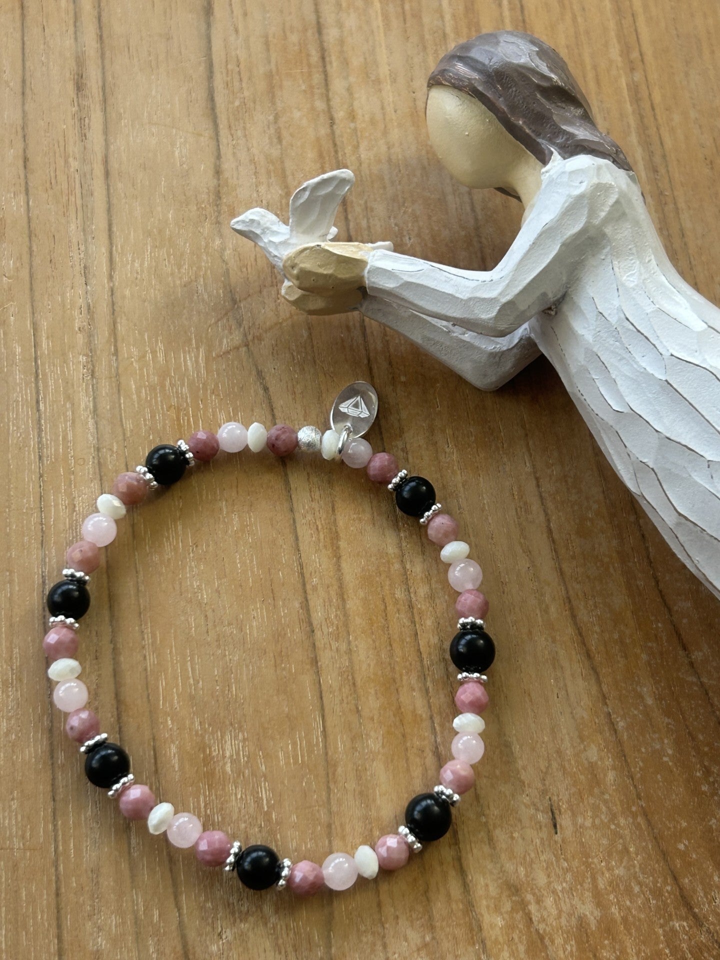 Heilsteine (Link zu Beschreibung und Wirkung): Gagat, Perlmutt weiss, Rhodonit, Rosenquarz