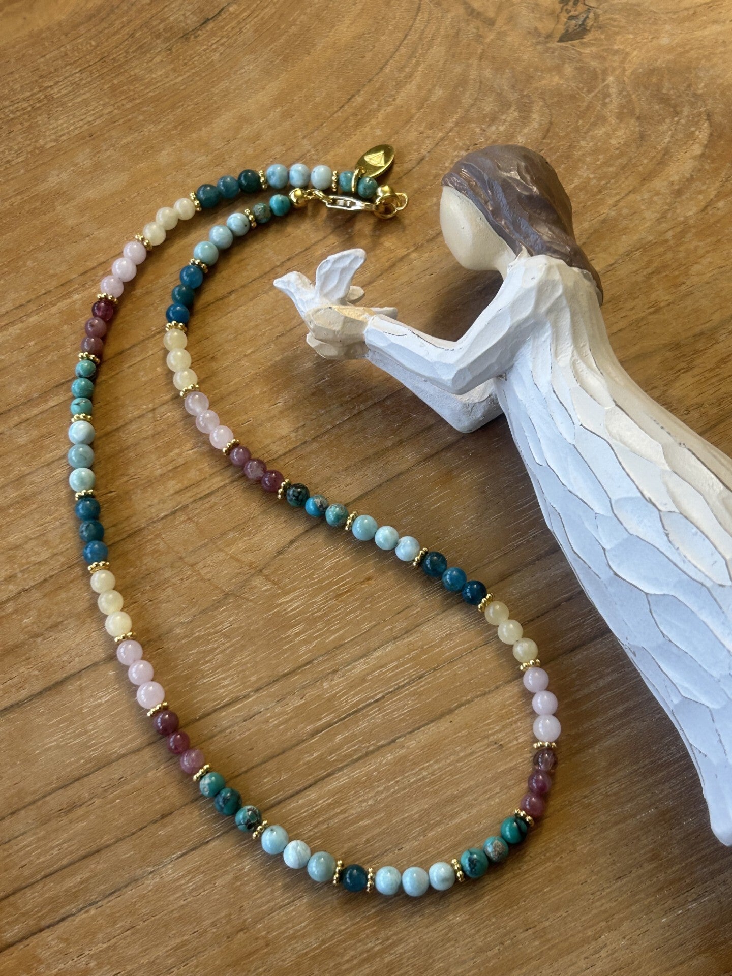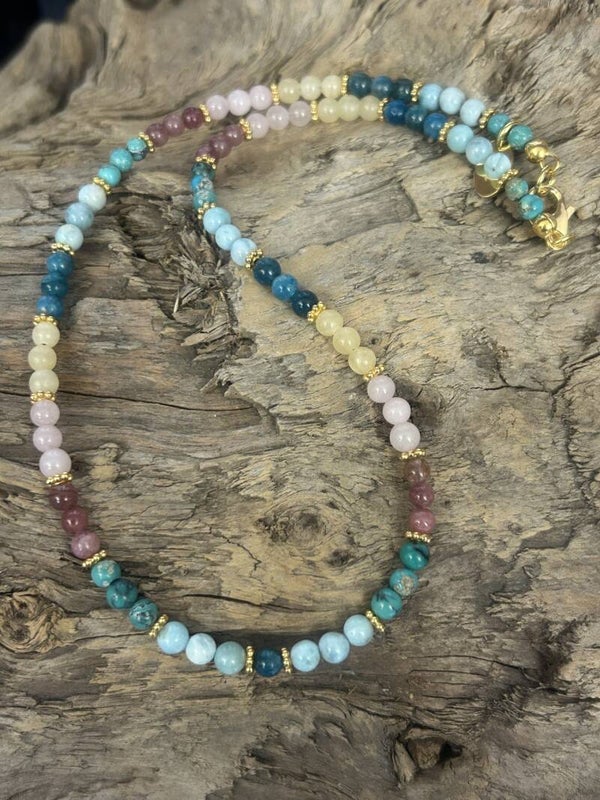 Heilsteine (Link zu Beschreibung und Wirkung): Apatit blau, Calcit gelb, Larimar, Rosenquarz, Türkis Tibet, Turmalin rosa (Rubellit)