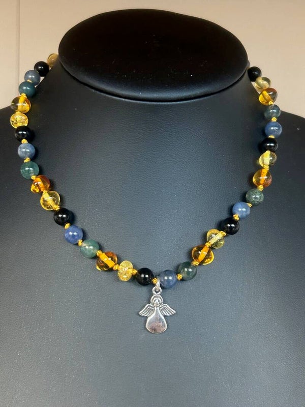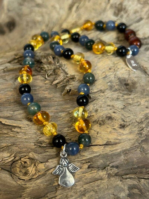 Länge auf diesem Bild: 34 cm (Deine genaue Wunschlänge im Kommentar eintragen und die entsprechende Preisklasse wählen); Silber 925 Anhänger "Schutzengel"; Steck-Sicherheitsverschluss aus Bernstein; Kugeln 6mm, Bernstein 5-7mm, jede Kugel einzeln mit Perlseide geknotet!