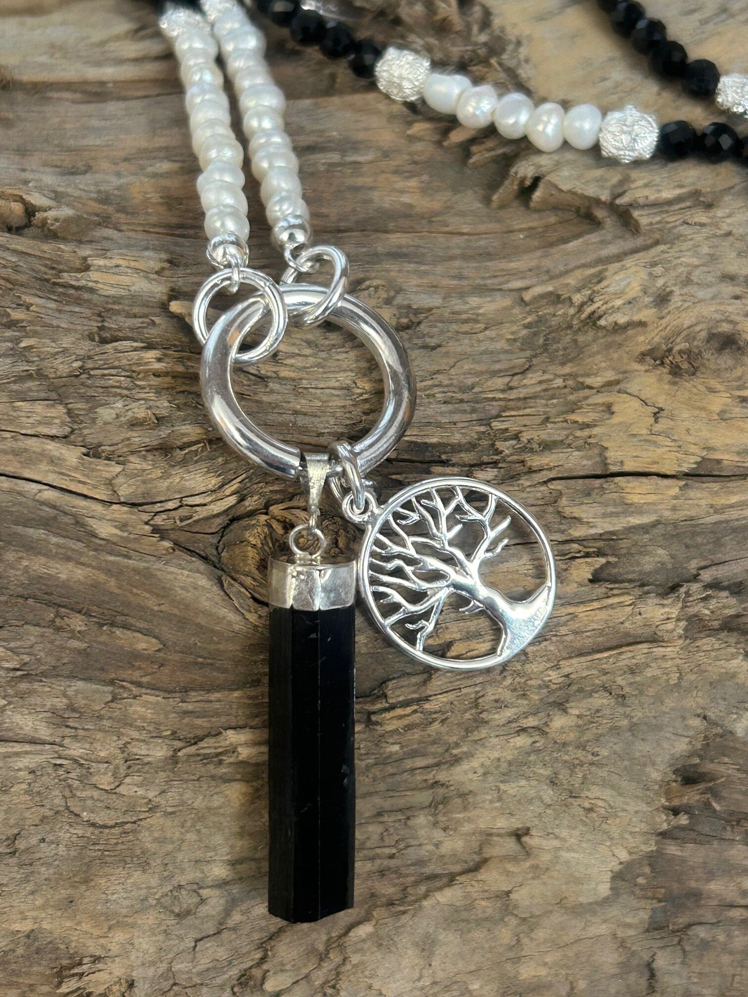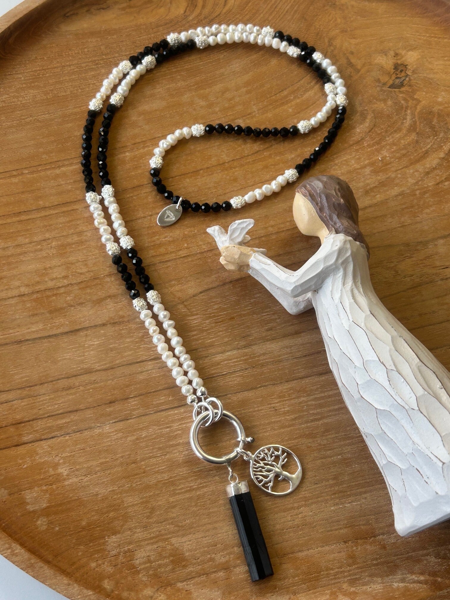 Länge auf diesem Bild: 75 cm + 6cm Anhänger Rohspitze; Silber 925 Federring, Biegeringe, Anhänger "Lebensbaum", verzierte Elemente; Kugeln 4mm und 4mm facettiert