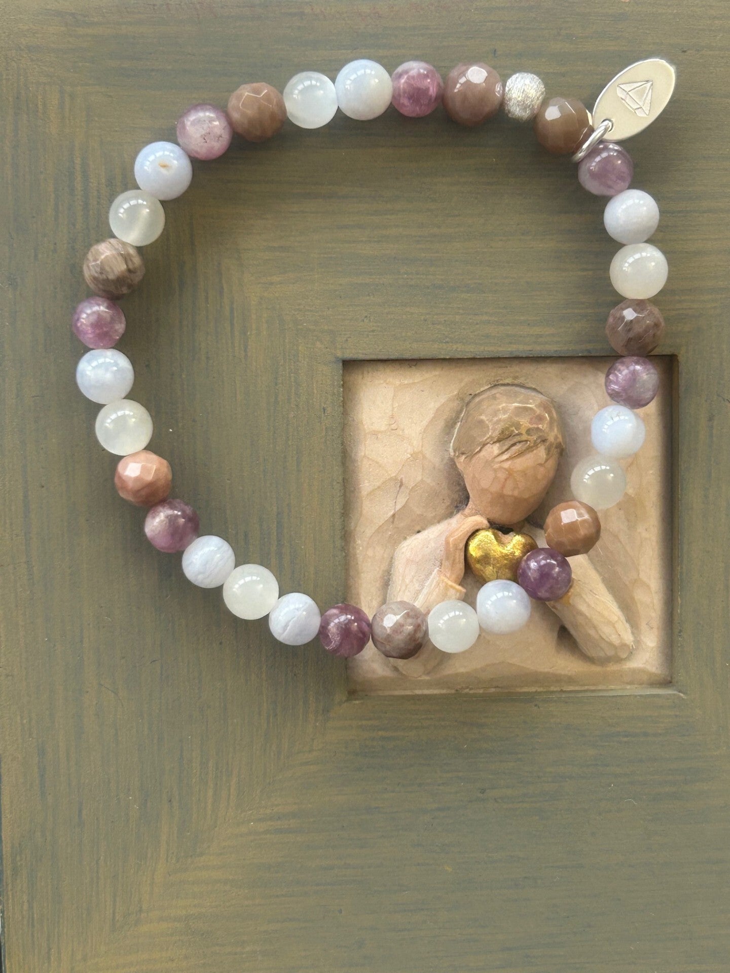 Heilsteine (Link zu Beschreibung und Wirkung): Chalcedon blau, Lepidolith, Mondstein weiss, Versteinertes Holz