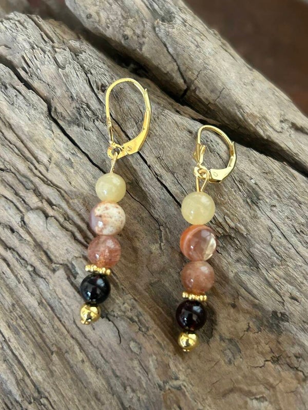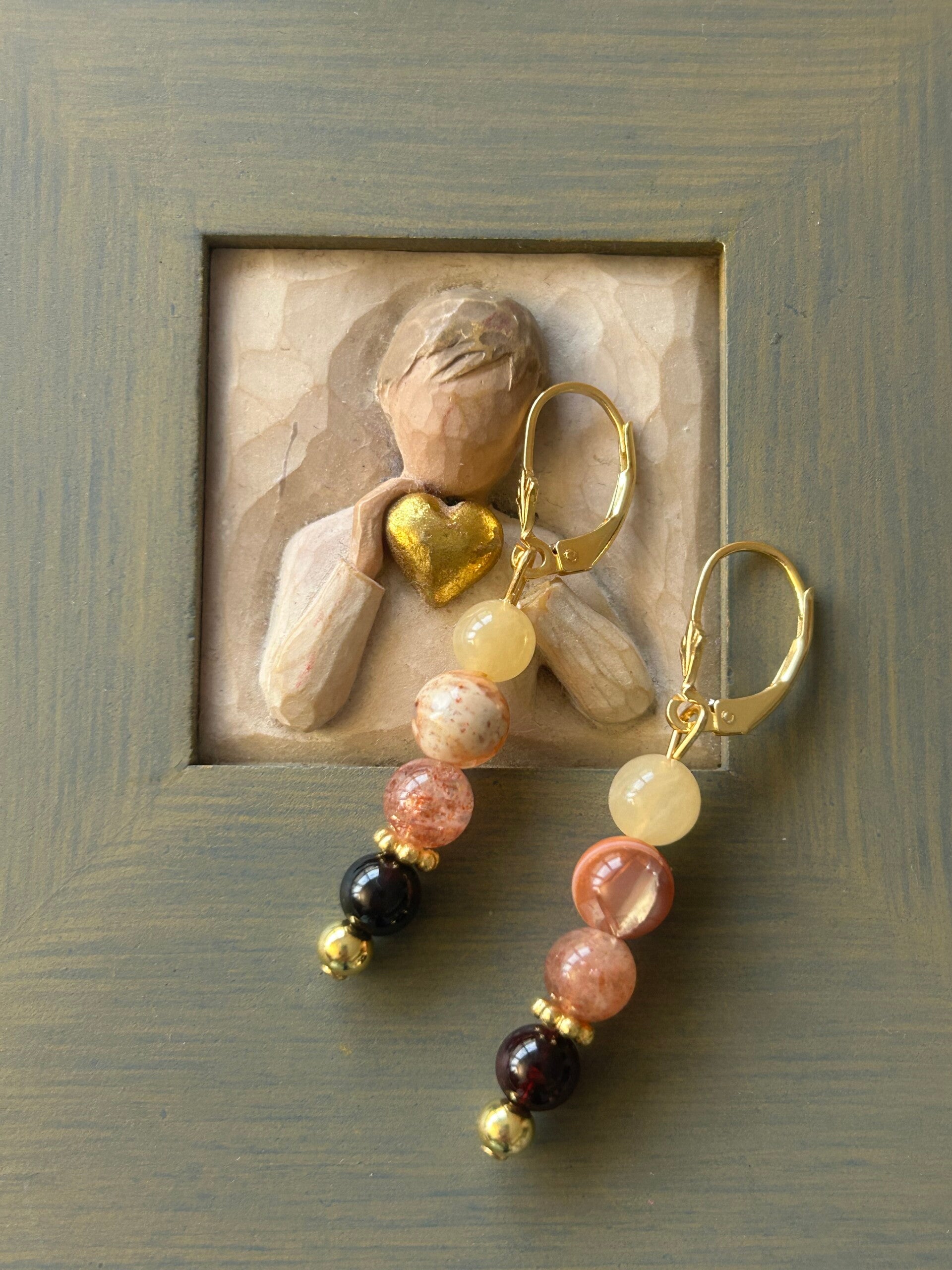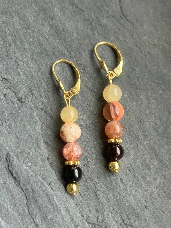 Heilsteine (Link zu Beschreibung und Wirkung): Calcit gelb, Feueropal, Granat, Sonnenstein