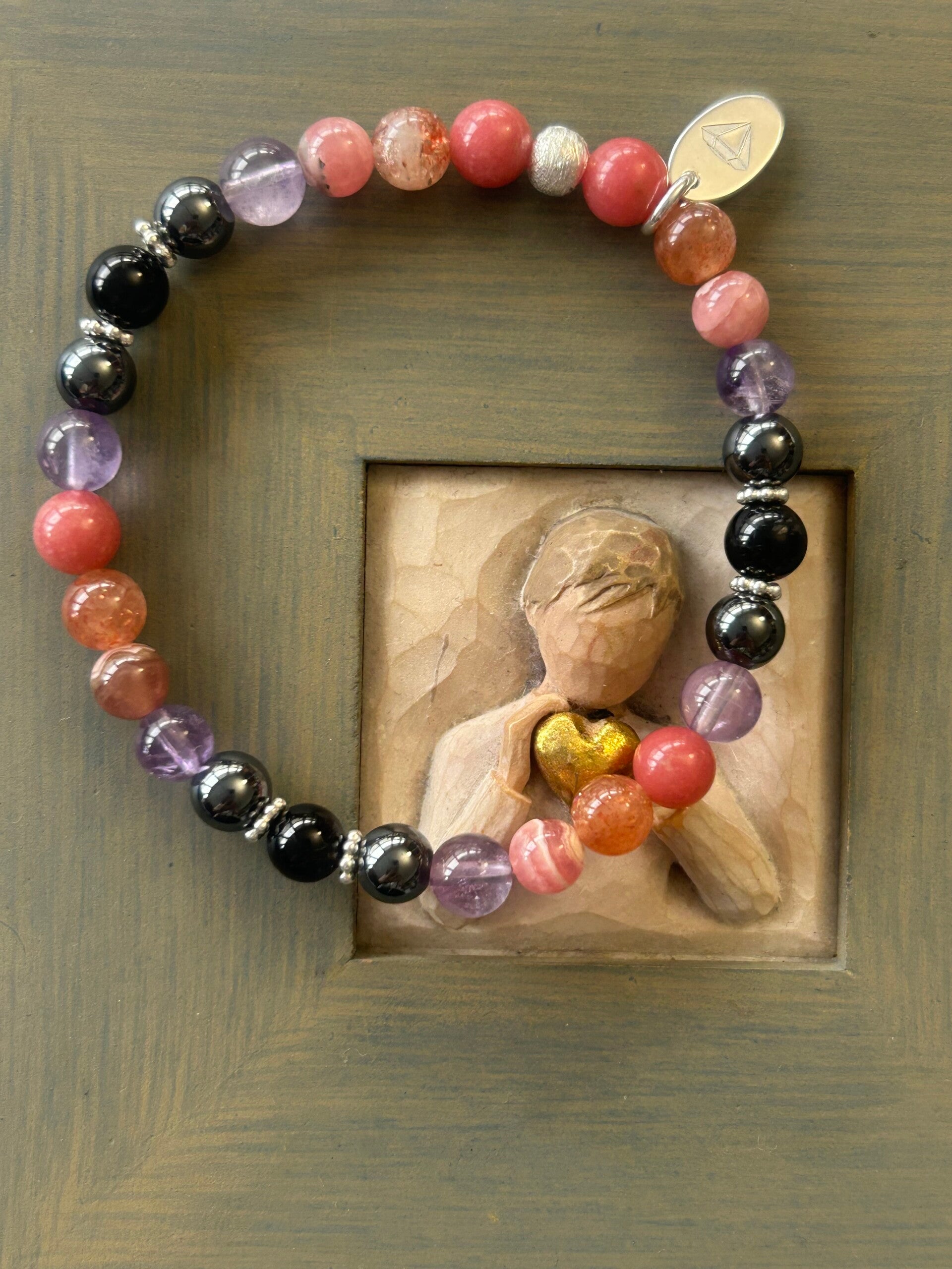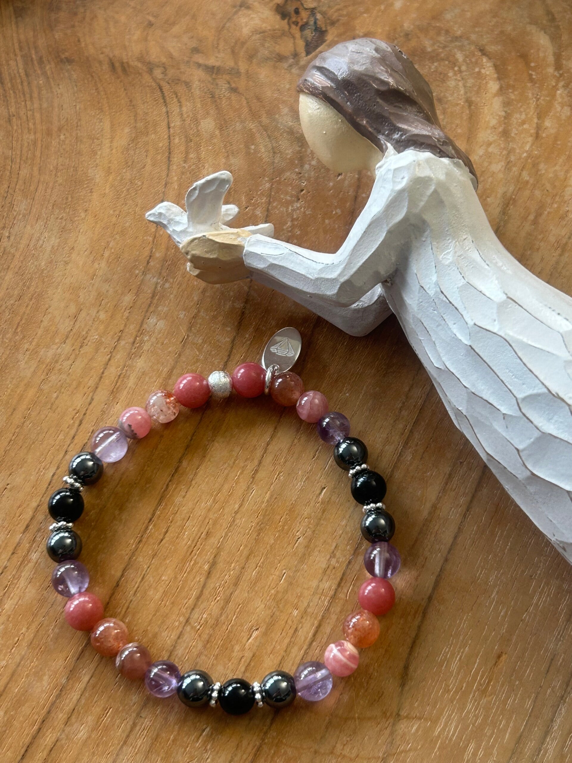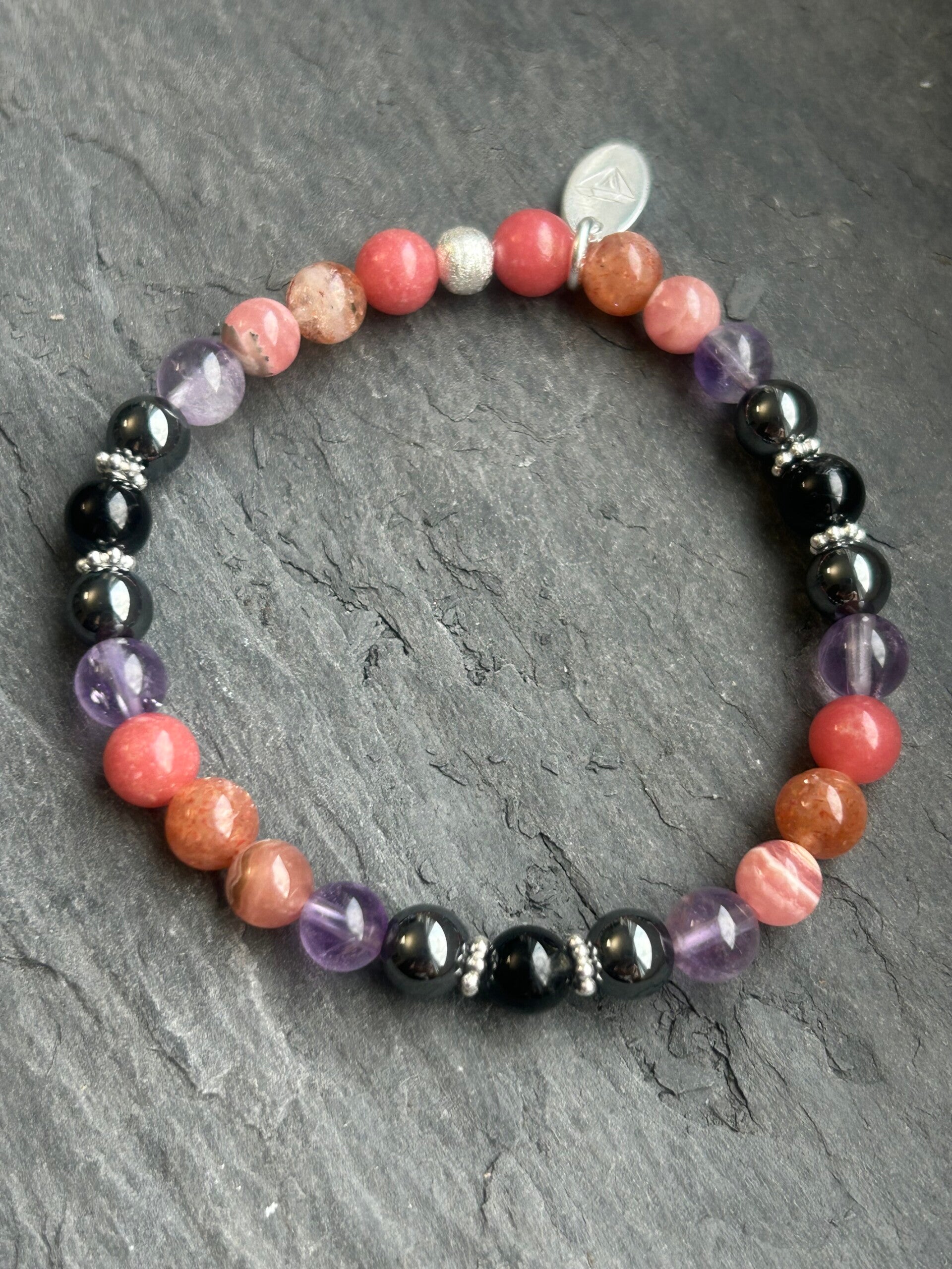Heilsteine (Link zu Beschreibung und Wirkung): Amethyst, Hämatit, Rhodochrosit, Sonnenstein, Thulit, Turmalin schwarz (Schörl)