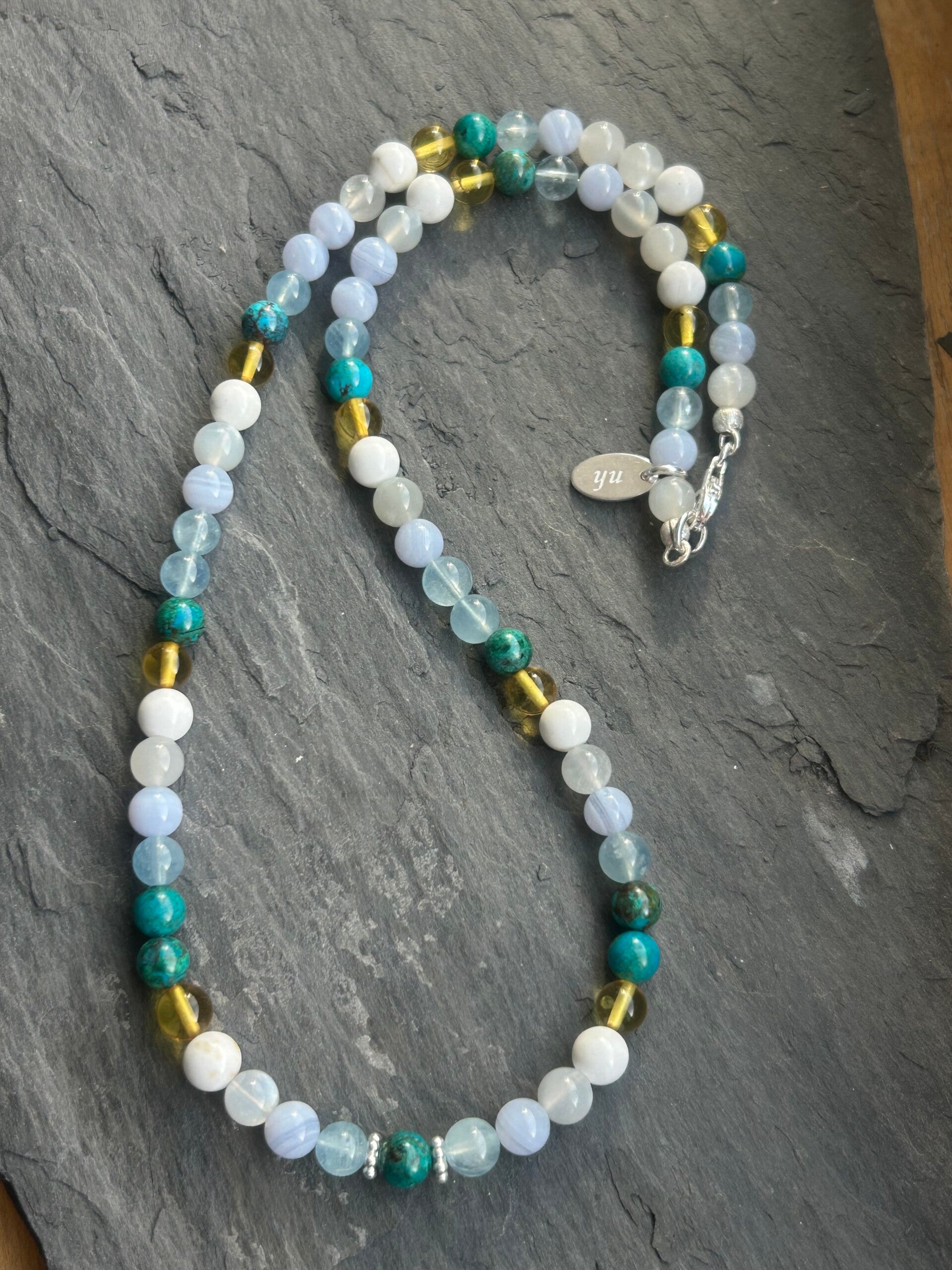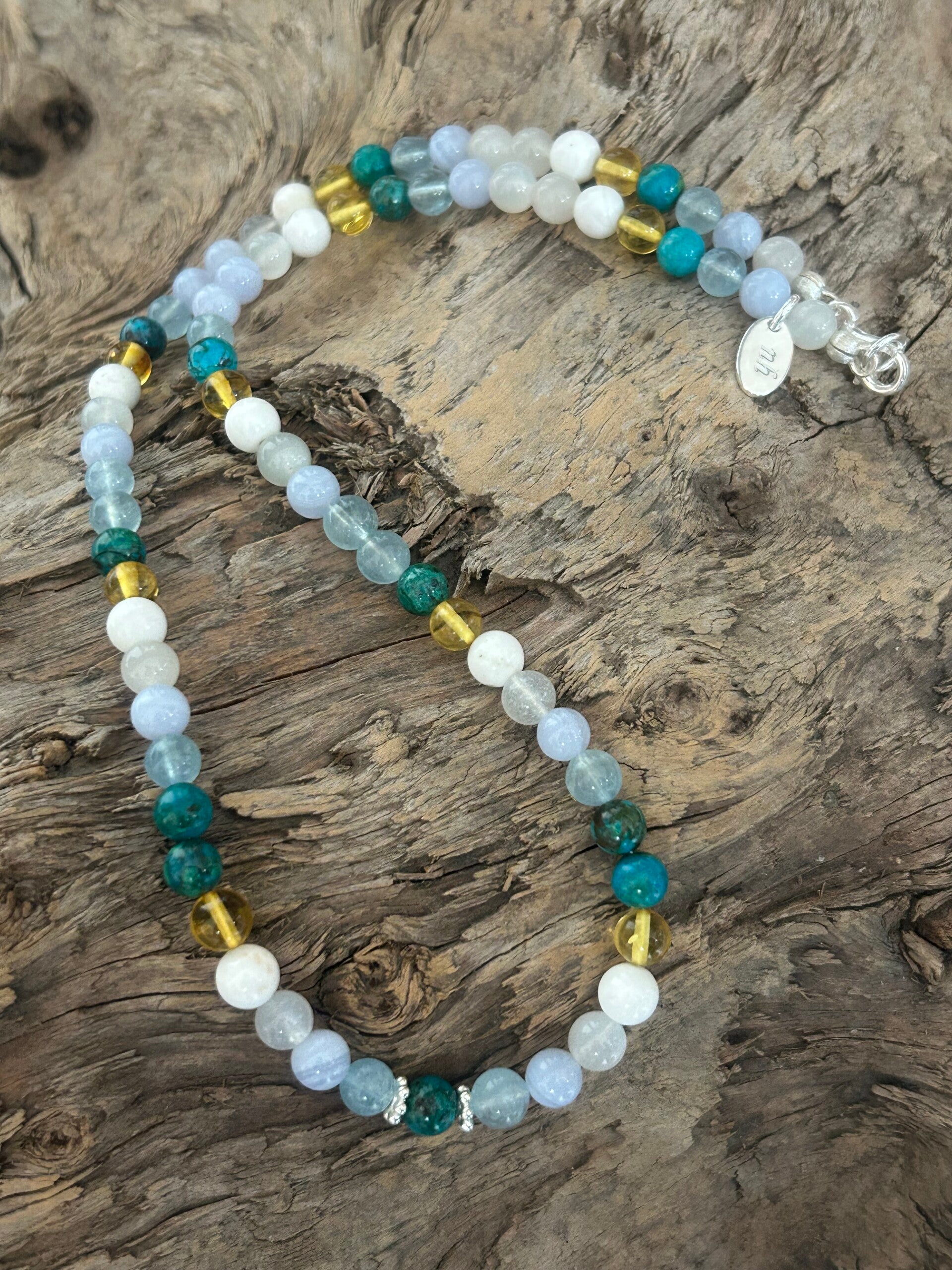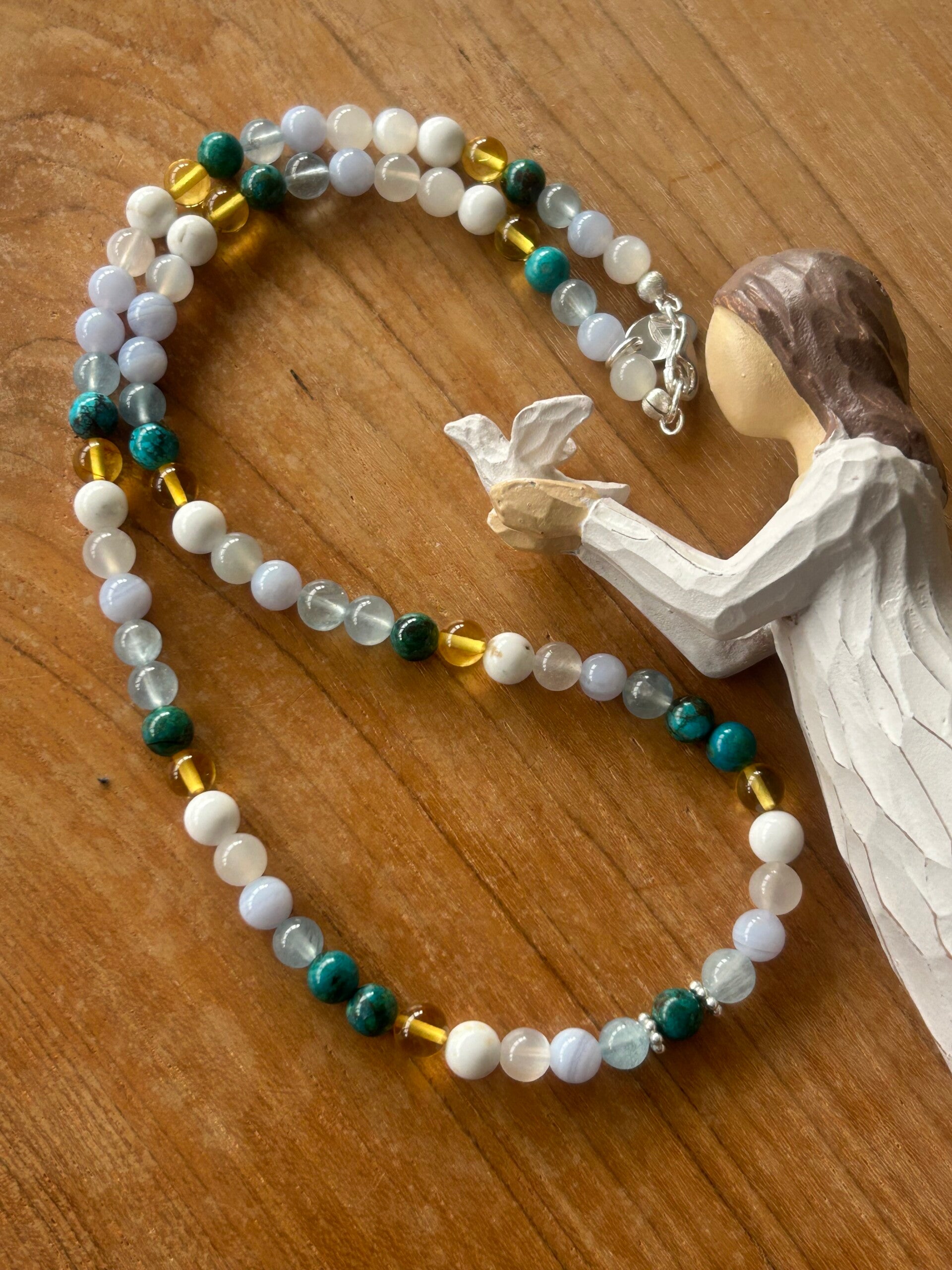 Heilsteine (Link zu Beschreibung und Wirkung): Bernstein, Beryll blau (Aquamarin), Chalcedon blau, Chrysokoll, Magnesit, Mondstein weiss