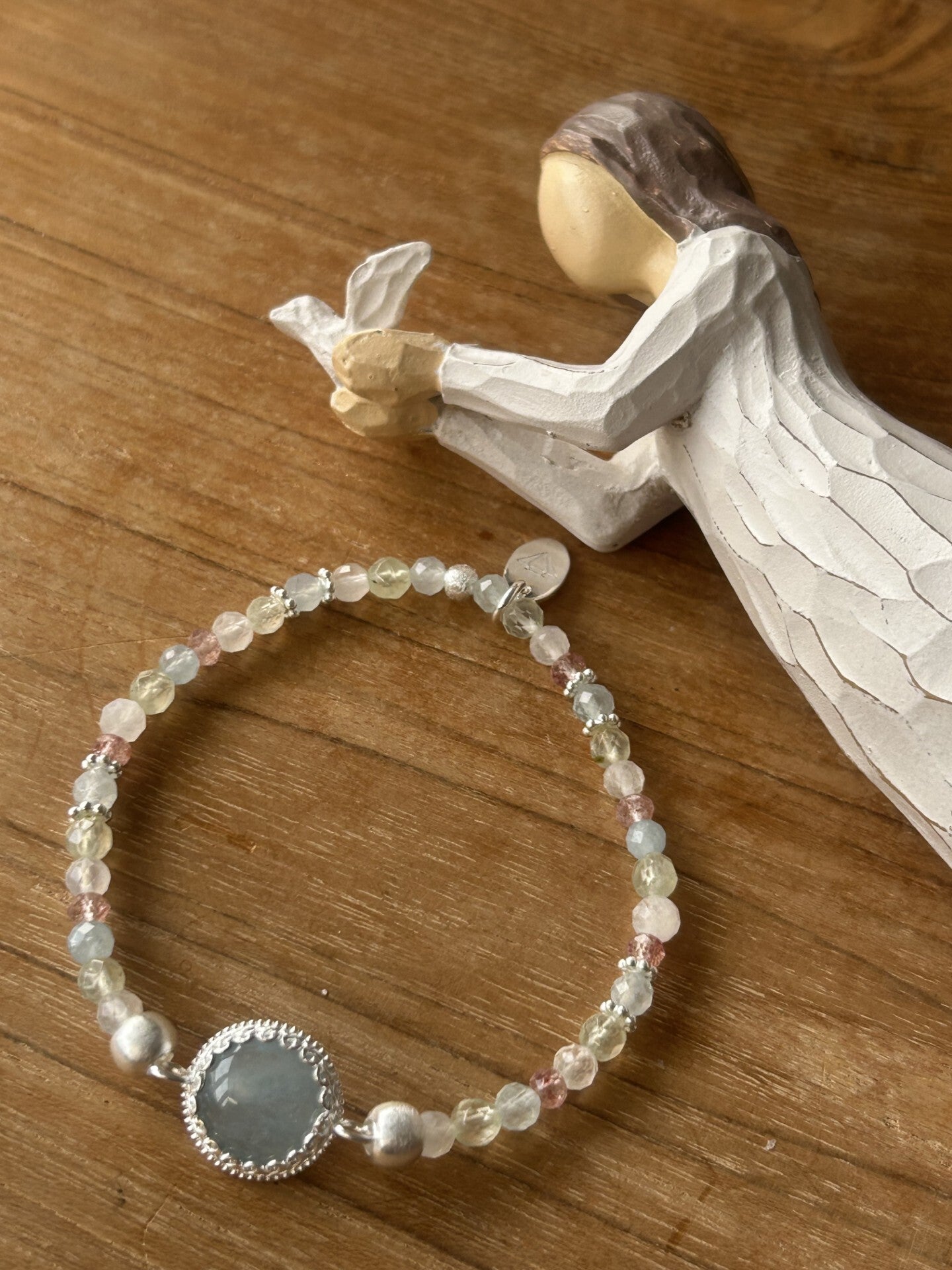 Heilsteine (Link zu Beschreibung und Wirkung): Beryll blau (Aquamarin), Erdbeerquarz, Labradorit weiss (Regenbogen-Mondstein), Prehnit