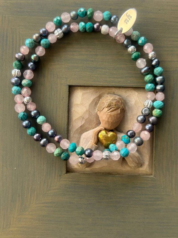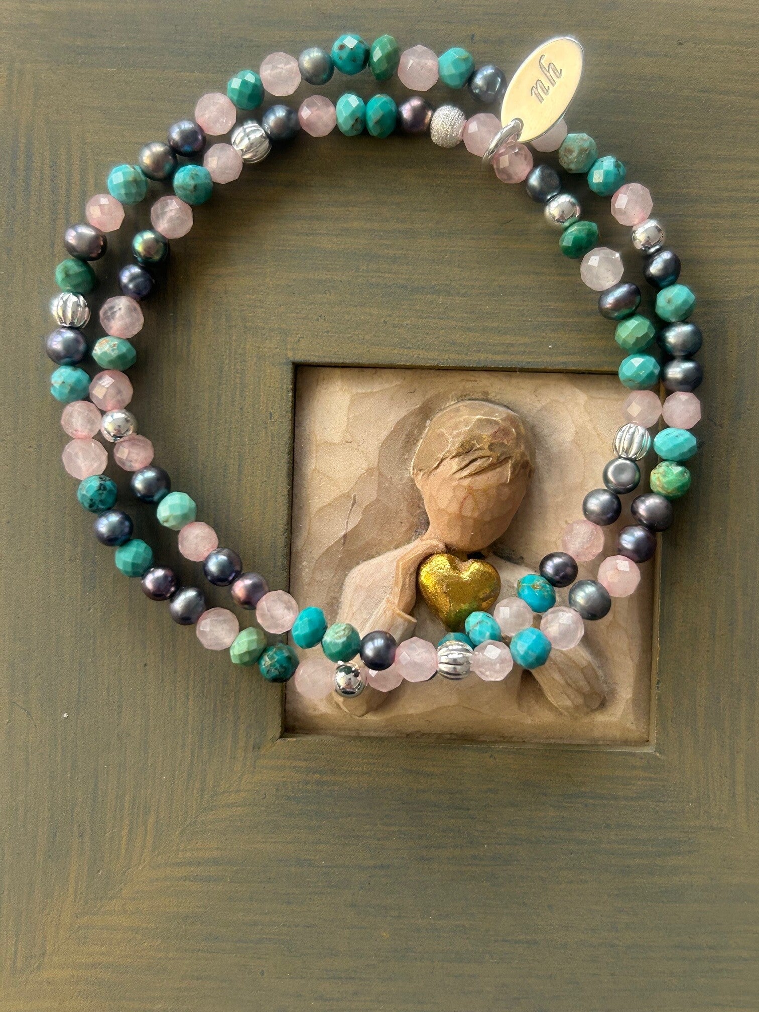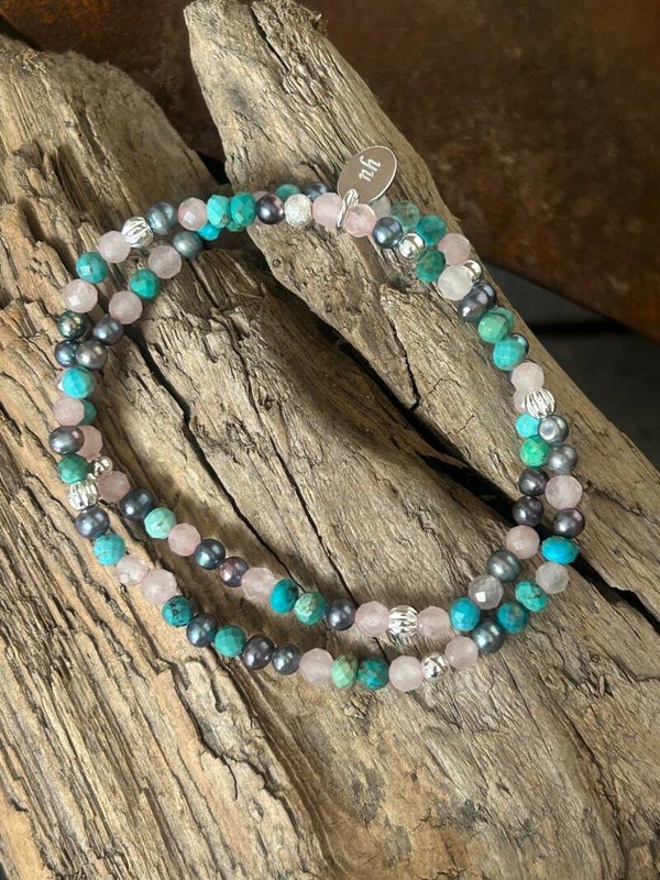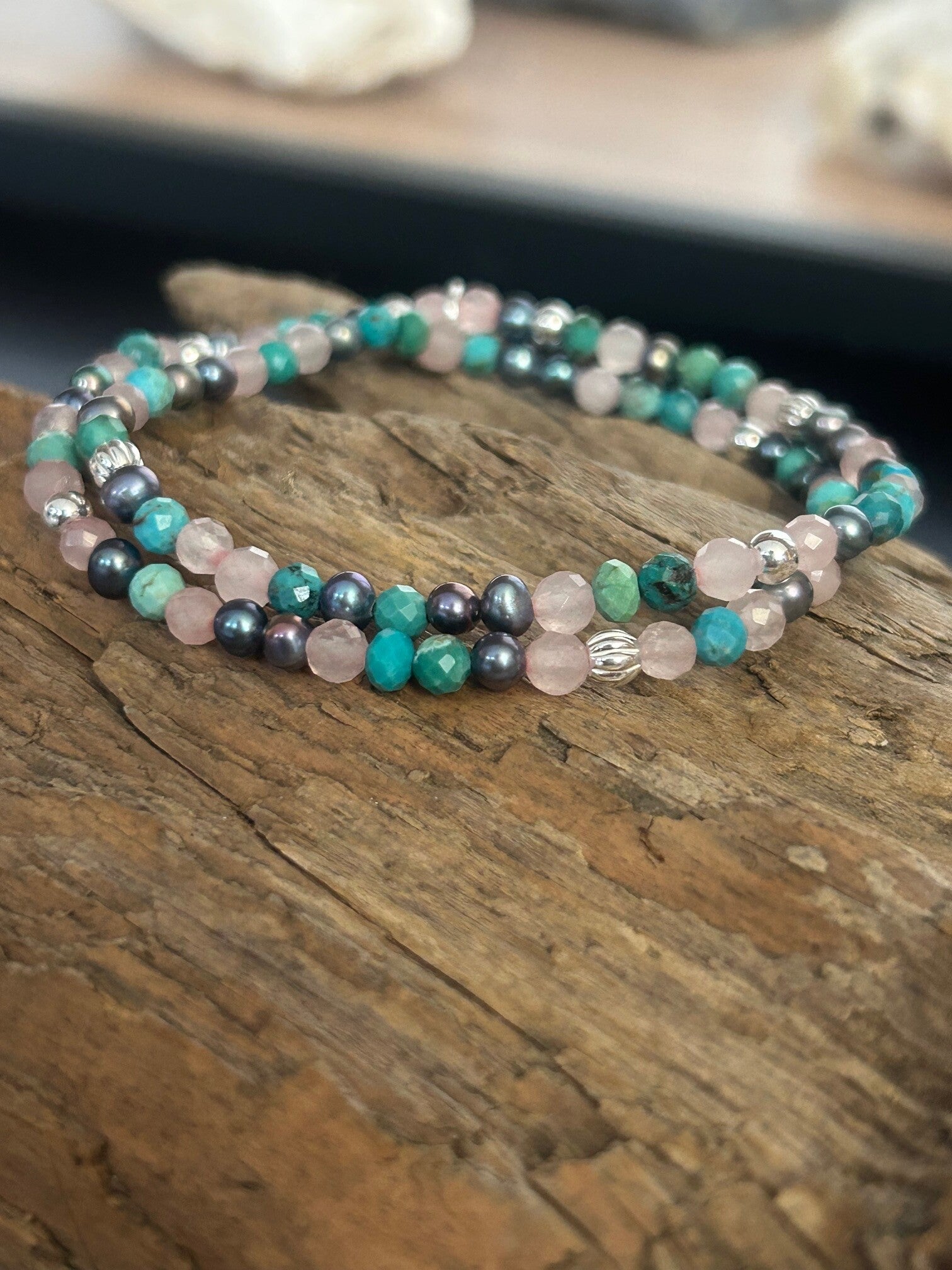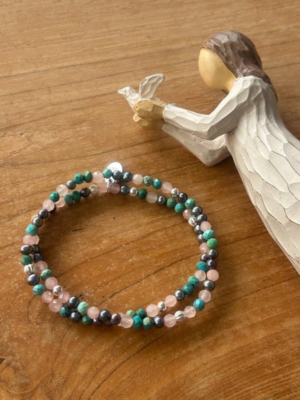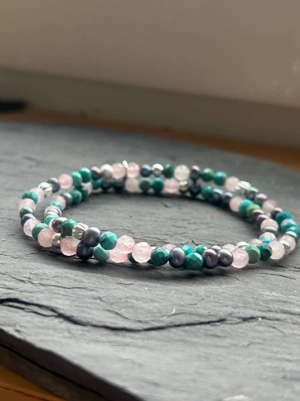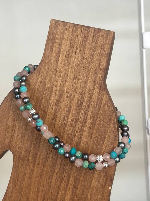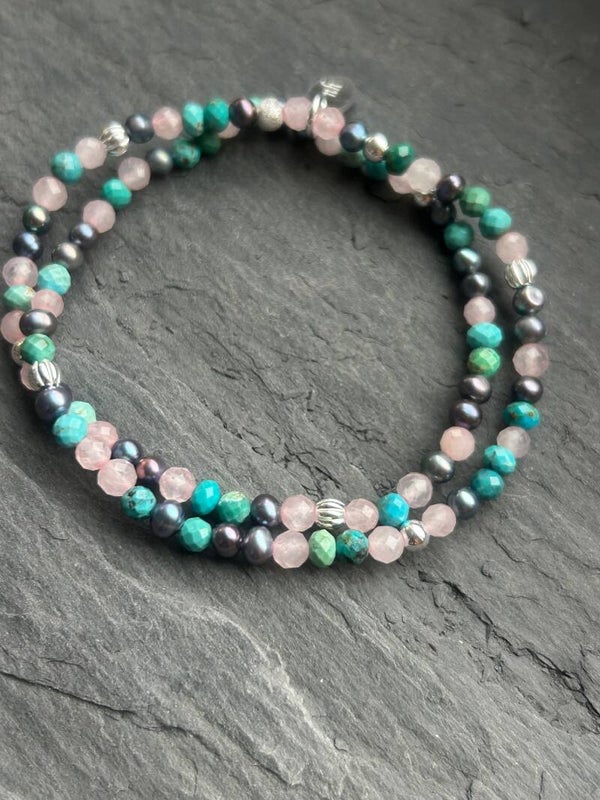 Wickelarmband (2-fach) - Rosenquarz, Süsswasserperle, Türkis (A831)