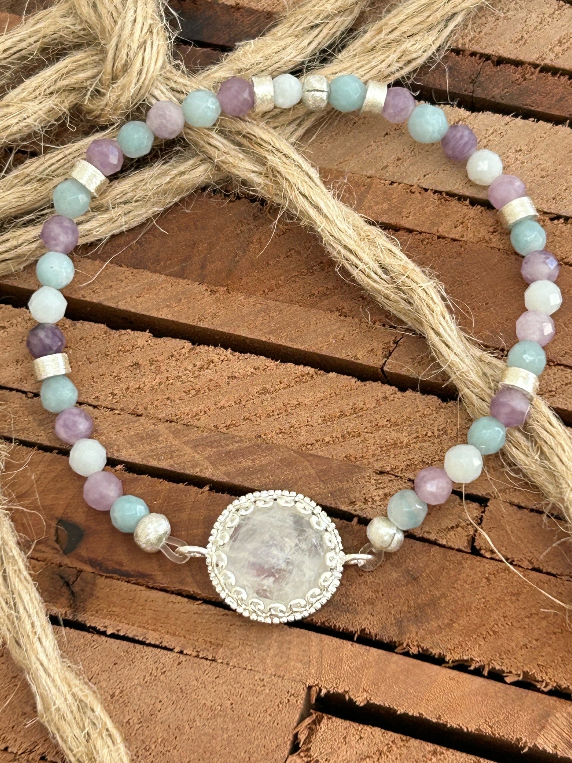 Hinweis: mit Stretch-Band; Silber matt 925 Zwischenteilen und Verbinder mit Regenbogen Mondstein facettiert