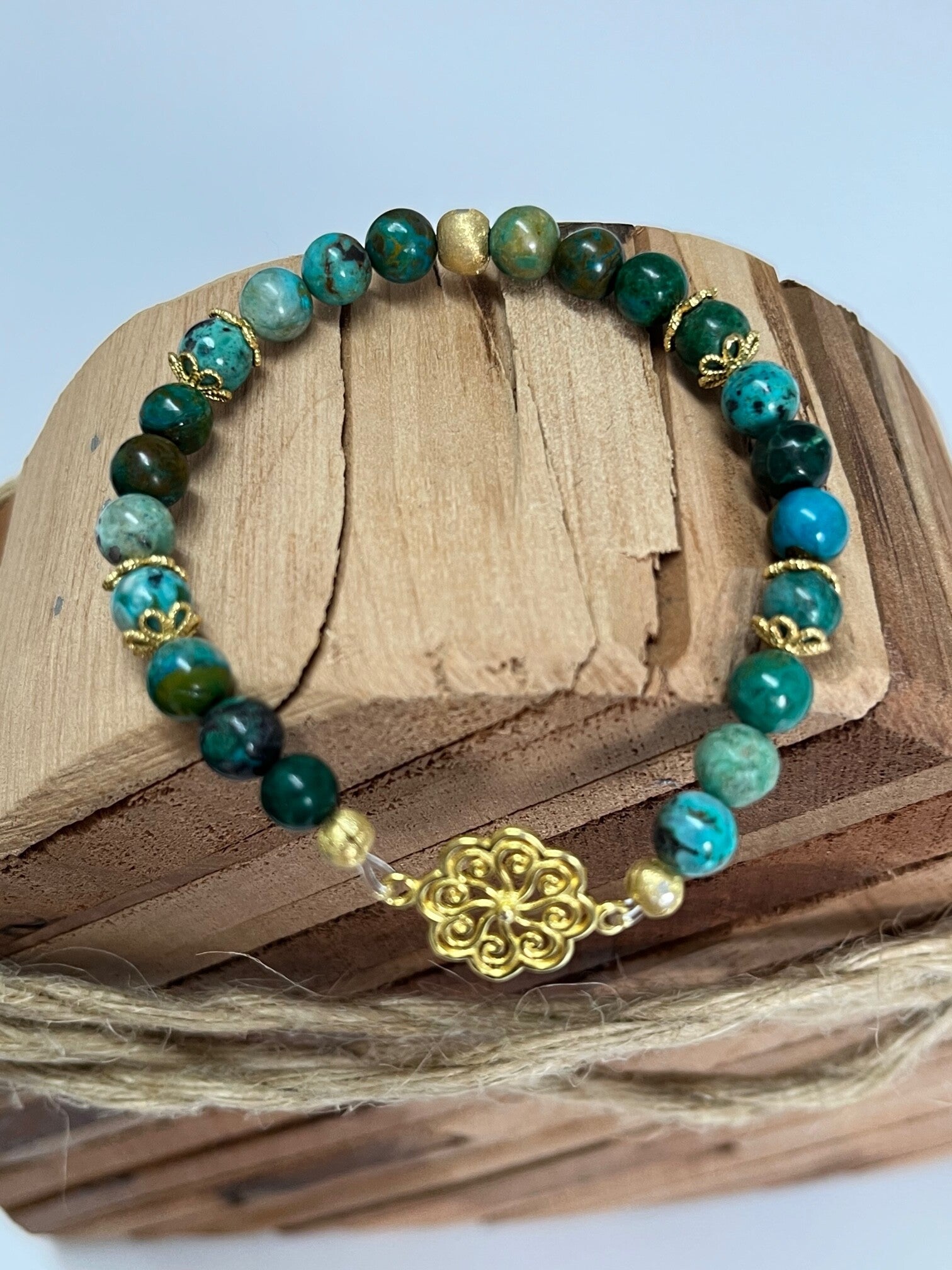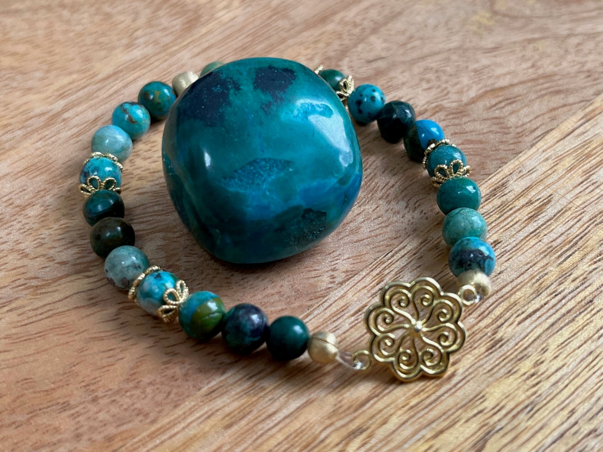 Chrysokoll: wirkt entkrampfend bei Menstruationsbeschwerden; wirkt blutdrucksenkend bei erhöhtem Blutdruck; entzündungshemmend sowie fiebersenkend bei Infektionen der oberen Atemwege; beruhigt Magen und Darmtrakt; regeneriert gestörtes Narbengewebe; hilft einen kühlen Kopf zu bewahren; nimmt Angst und Schuldgefühle; bringt Gefühle ins Gleichgewicht