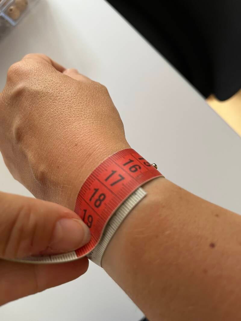 Miss dein Handgelenk auf der Höhe des Knöchels. Das Resultat (auf dem Bild 16cm) um 1cm erhöhen (ergibt in diesem Fall 17cm). 17cm ist die korrekte Länge, wenn du das Armband gerne anliegend trägst!